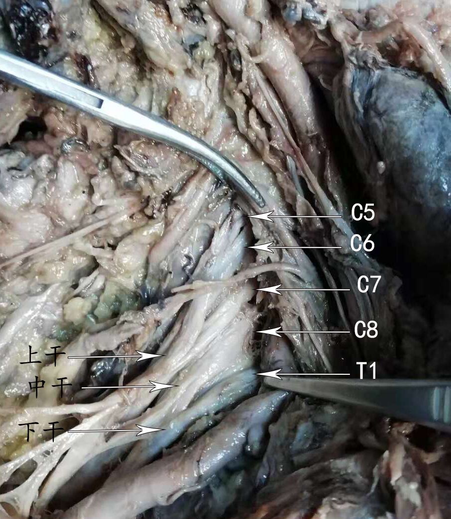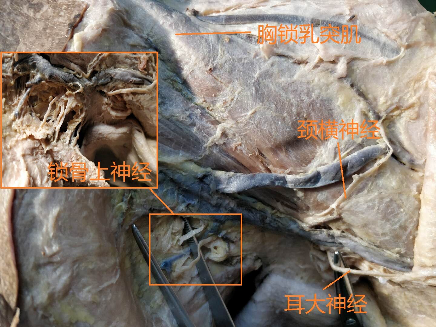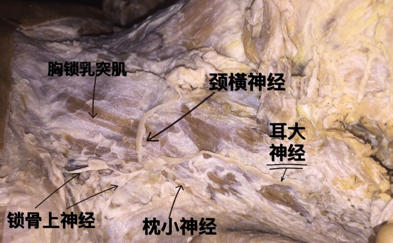 颈丛皮神经于胸锁乳突肌后缘中点处浅出,此处称神经点。有枕小神经;耳大神经;颈横神经和锁骨上神经。枕小神经沿胸锁乳突肌后缘走行;耳大神经伴颈外浅静脉上行;颈横神经垂直于胸锁乳突肌向前走行;锁骨上神经有三支与副神经粗细相似.