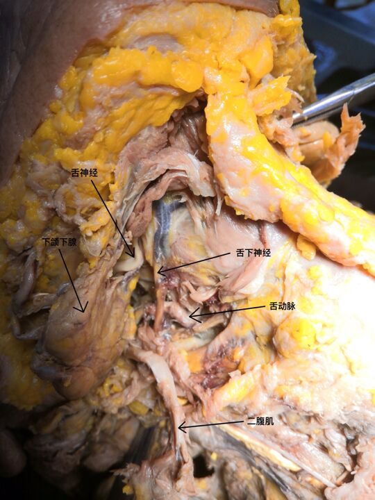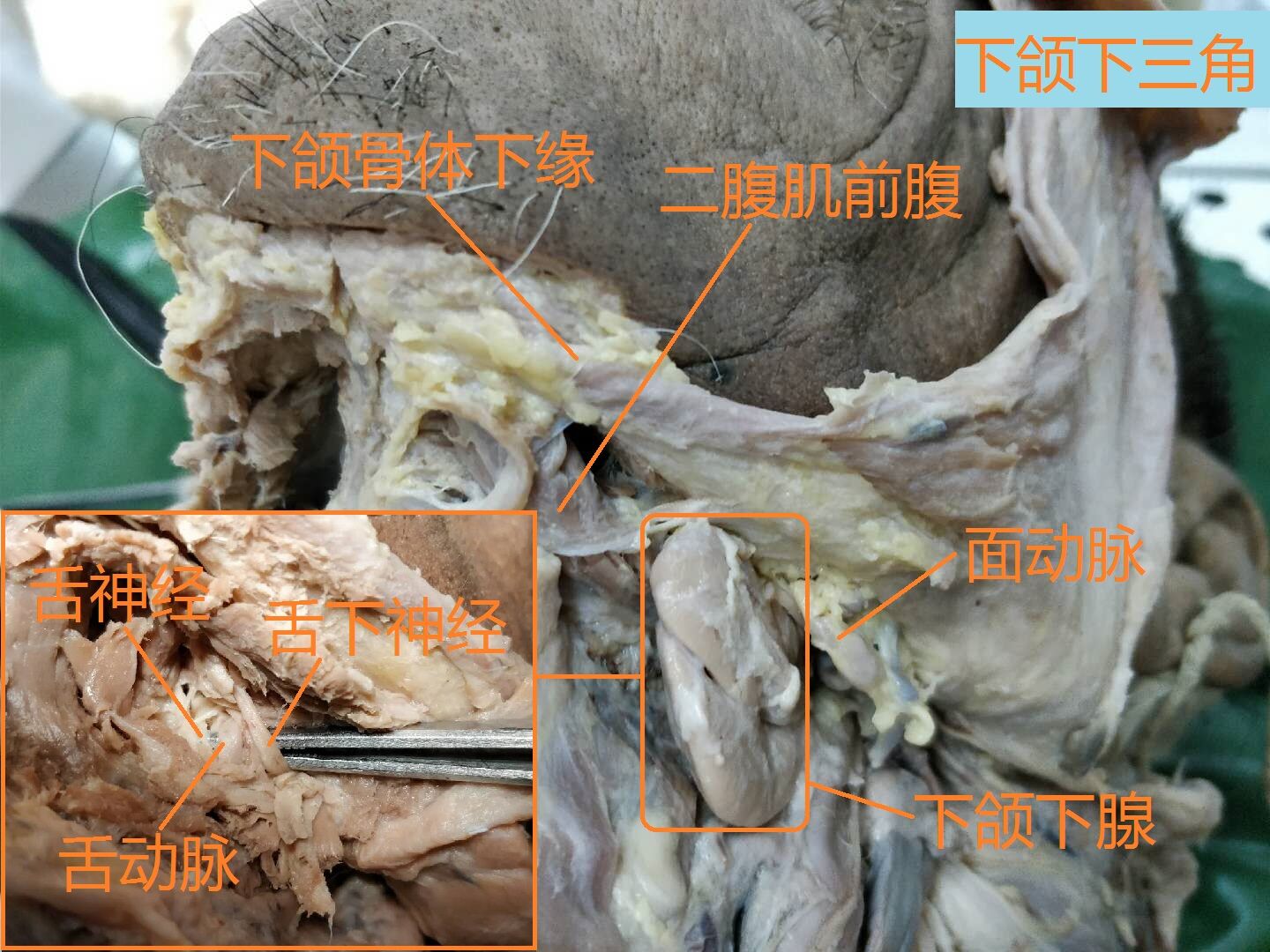 在下颌下三角内有一个腺体,两条血管和两条神经,即下颌下腺,面动脉,舌神经,舌下神经,舌动脉。
