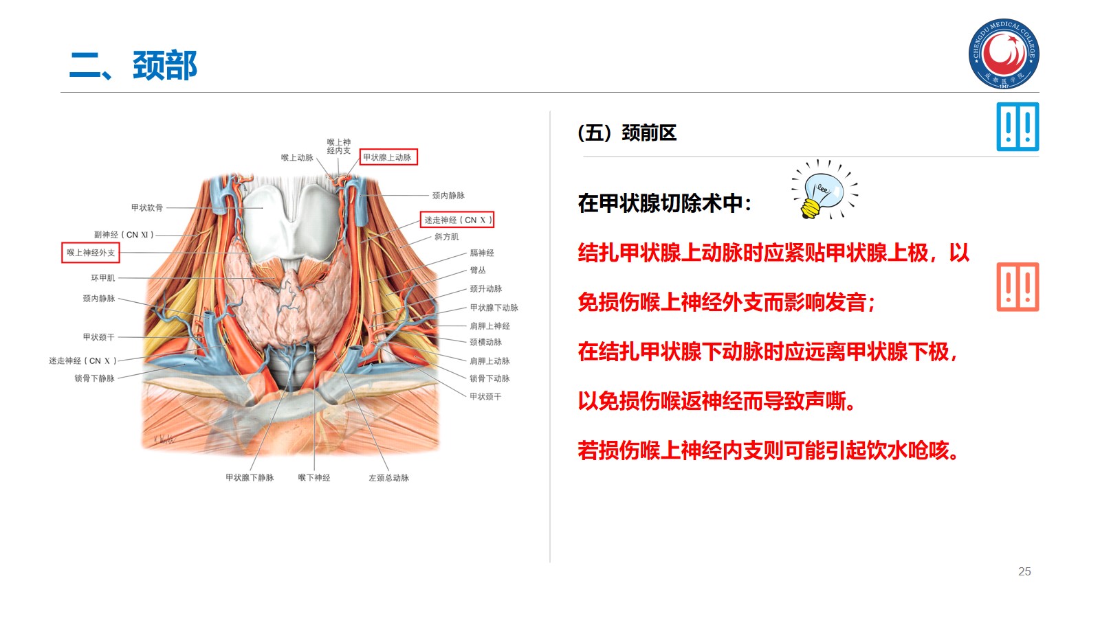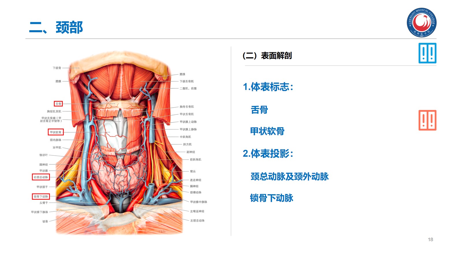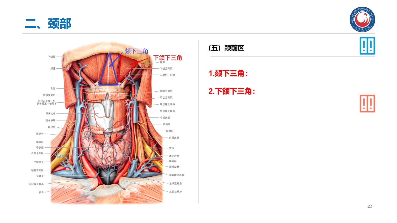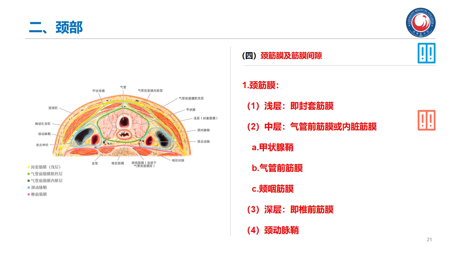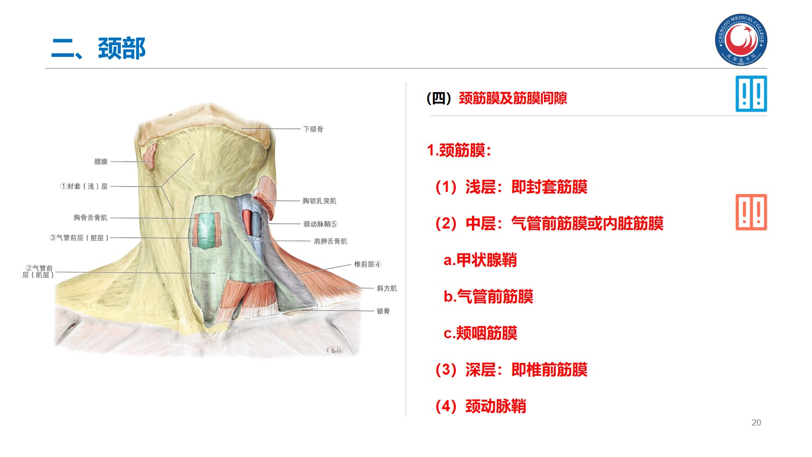 掌握:颈部的表面解剖、颈筋膜间隙及交通。颈部浅静脉的特点及其临床意义,颈动脉三角的境界、层次,颈动脉鞘的构成、内容及毗邻关系。甲状腺形态、位置、毗邻、血供及与神经支配的关系。