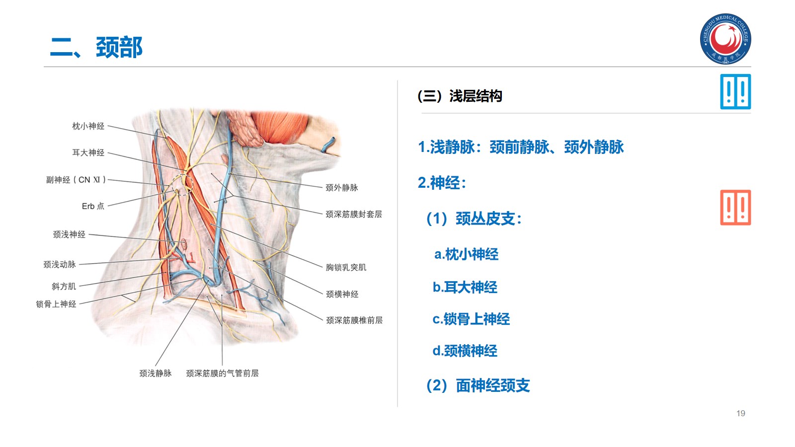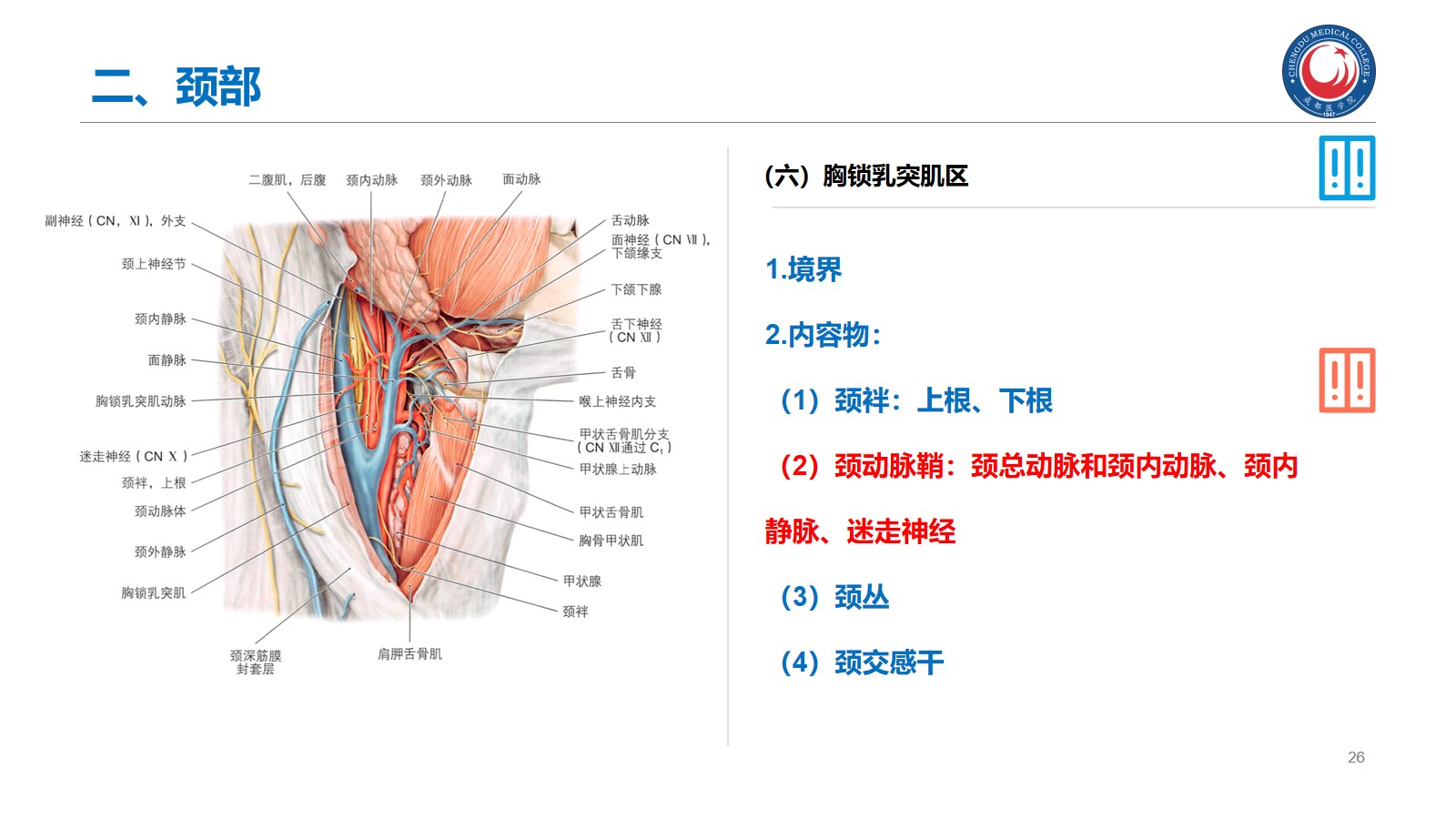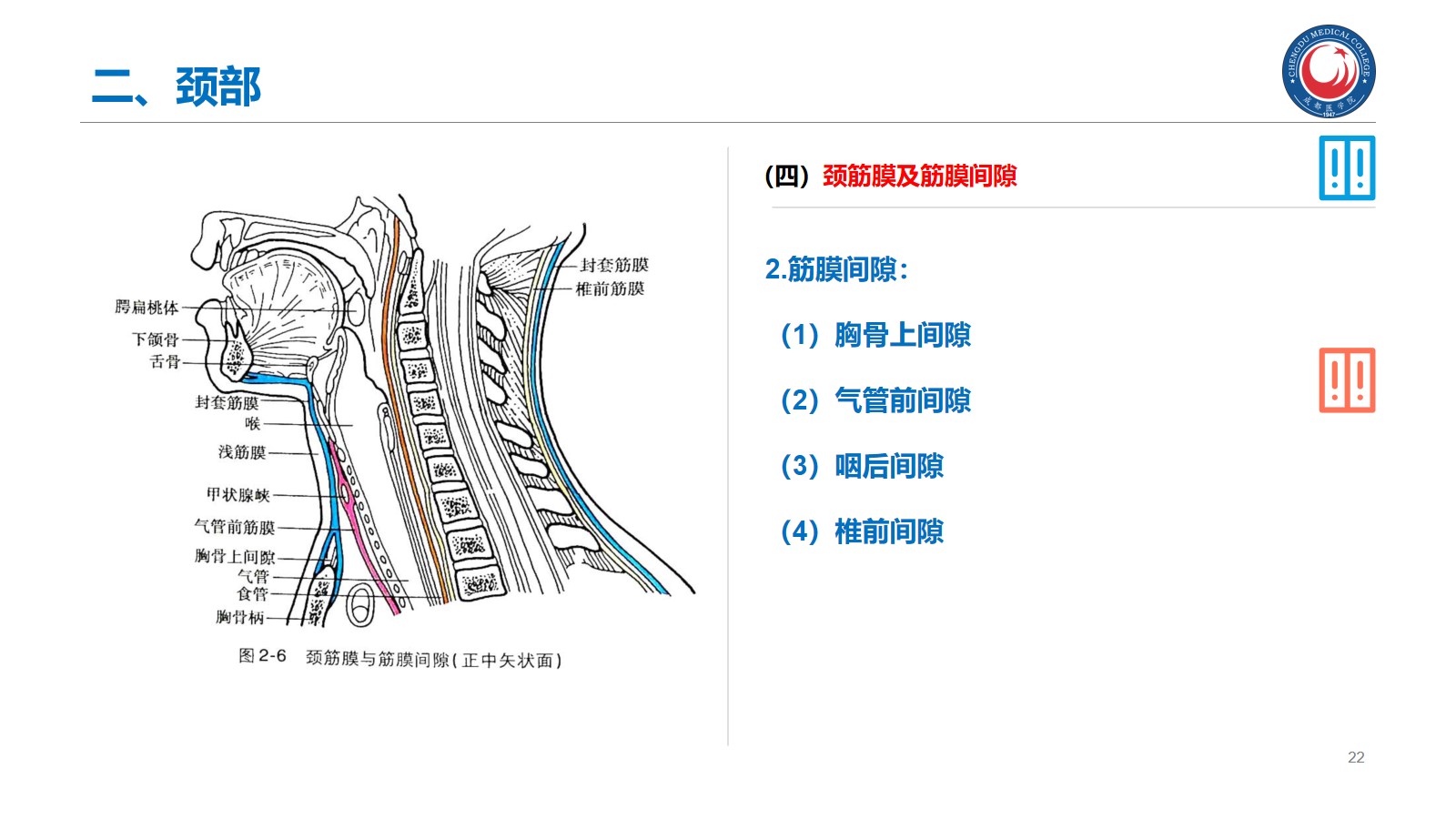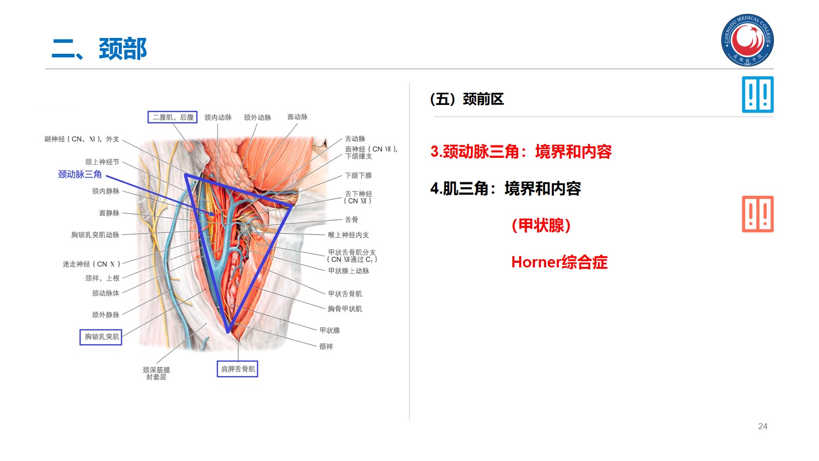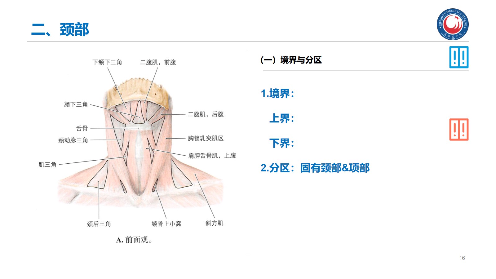 掌握:颈部的表面解剖、颈筋膜间隙及交通。颈部浅静脉的特点及其临床意义,颈动脉三角的境界、层次,颈动脉鞘的构成、内容及毗邻关系。甲状腺形态、位置、毗邻、血供及与神经支配的关系。