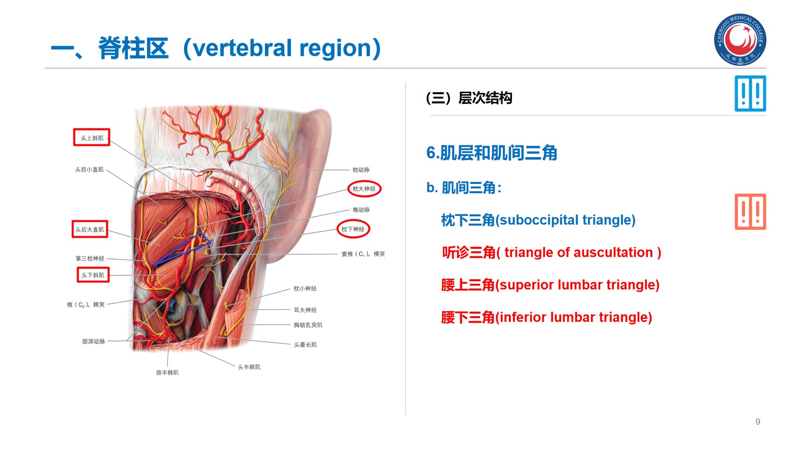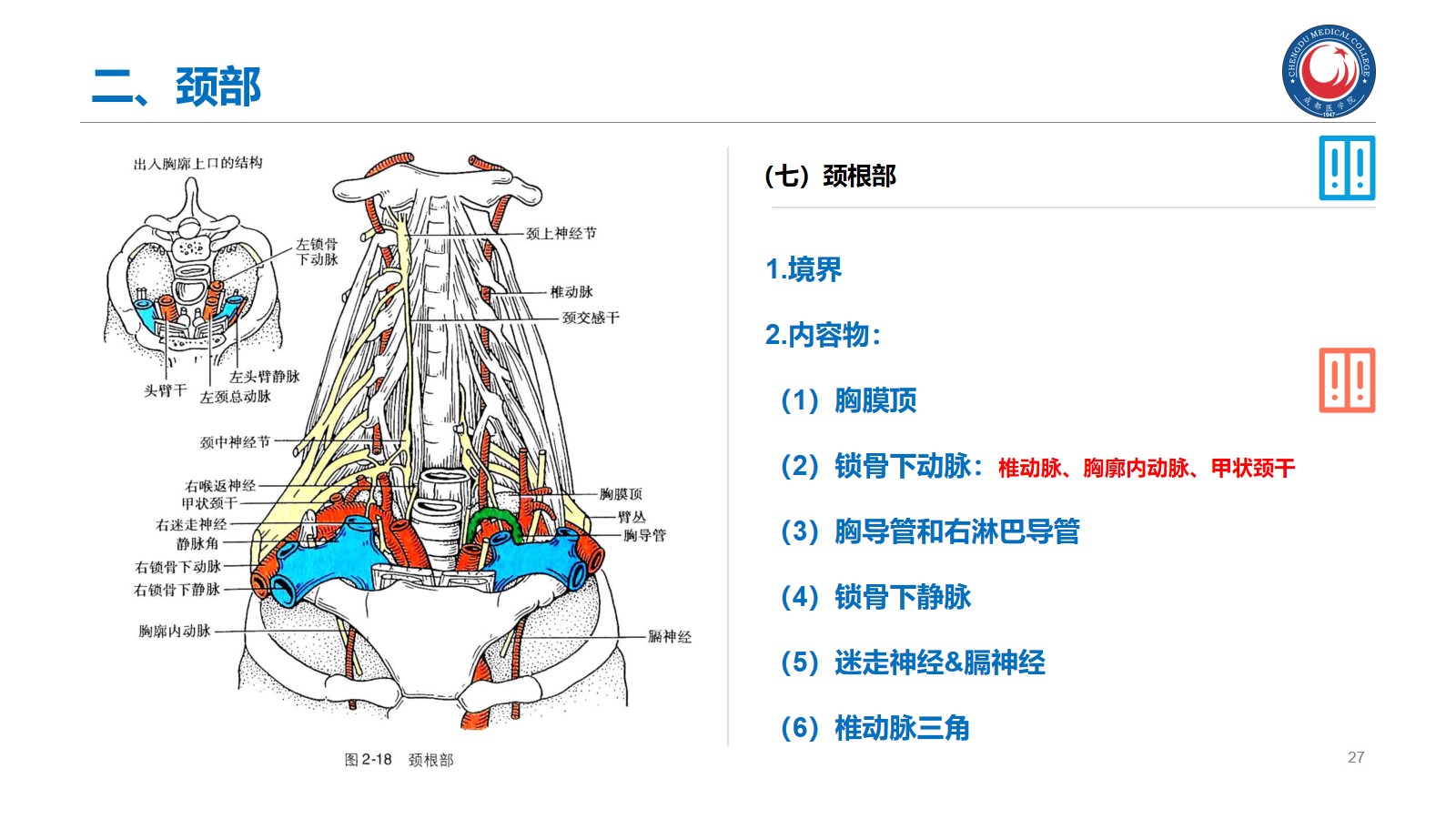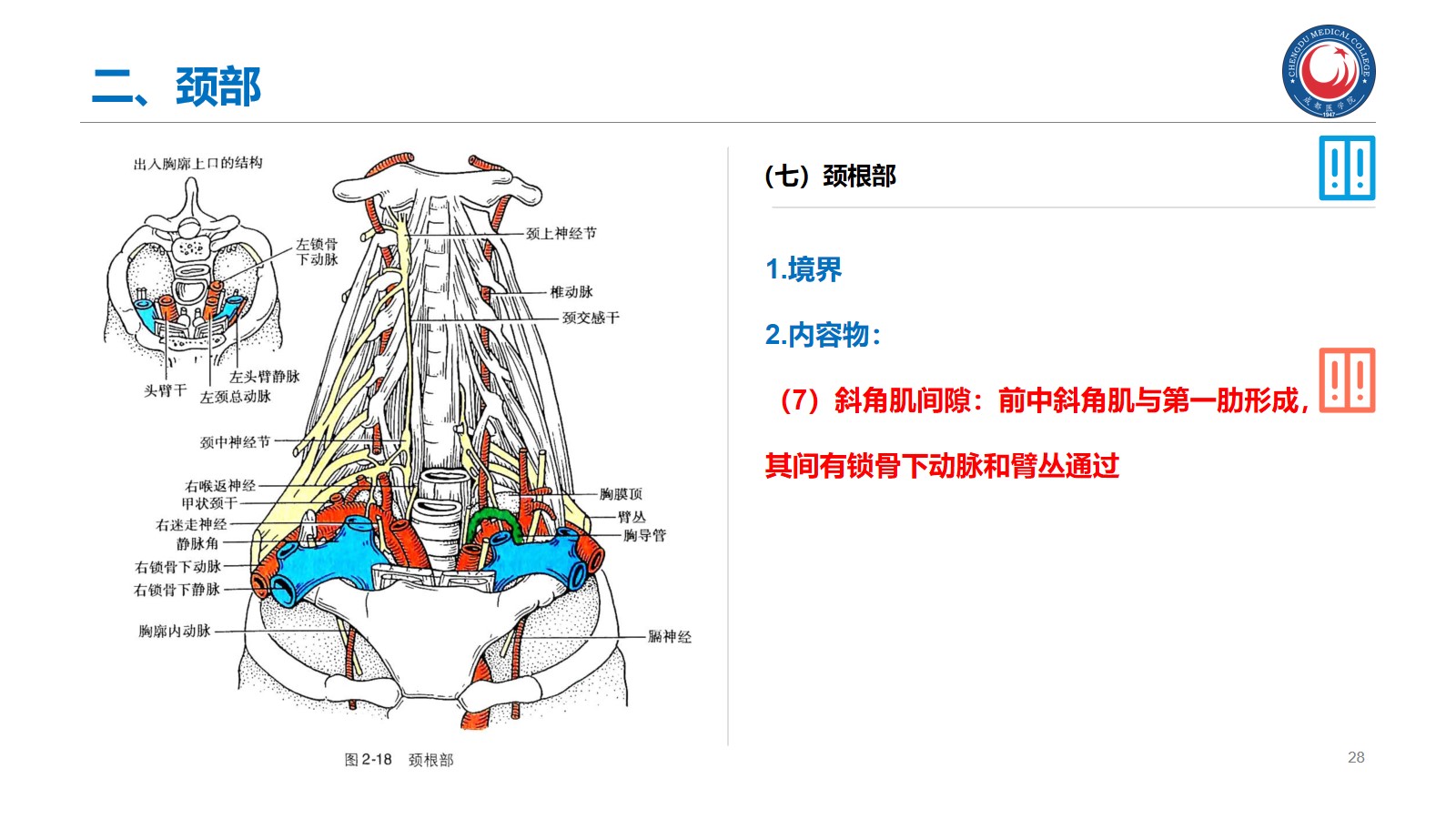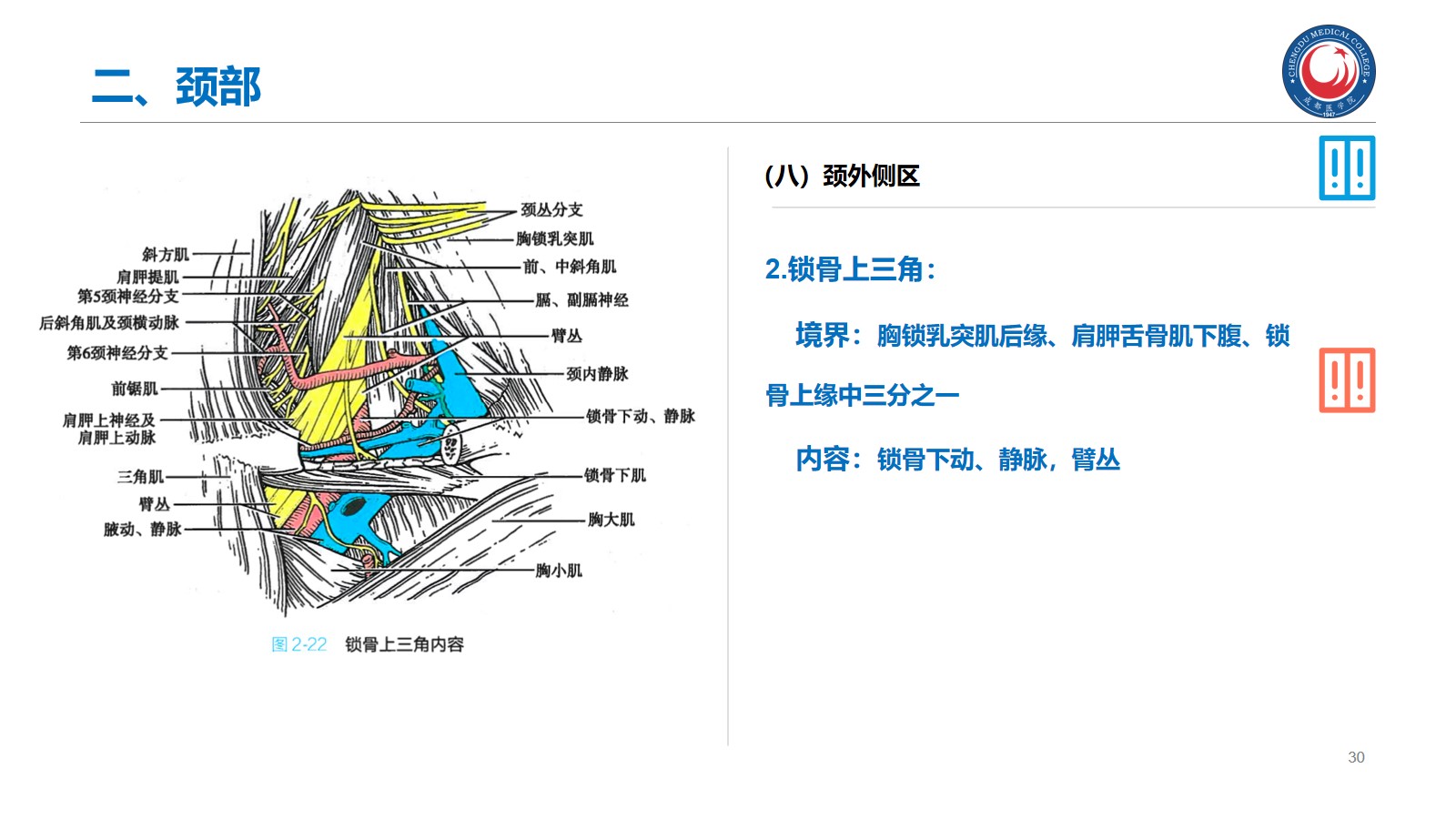 掌握:颈部的表面解剖、颈筋膜间隙及交通。颈部浅静脉的特点及其临床意义,颈动脉三角的境界、层次,颈动脉鞘的构成、内容及毗邻关系。甲状腺形态、位置、毗邻、血供及与神经支配的关系。