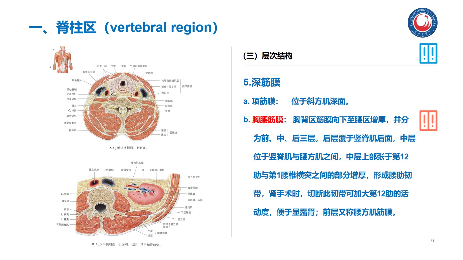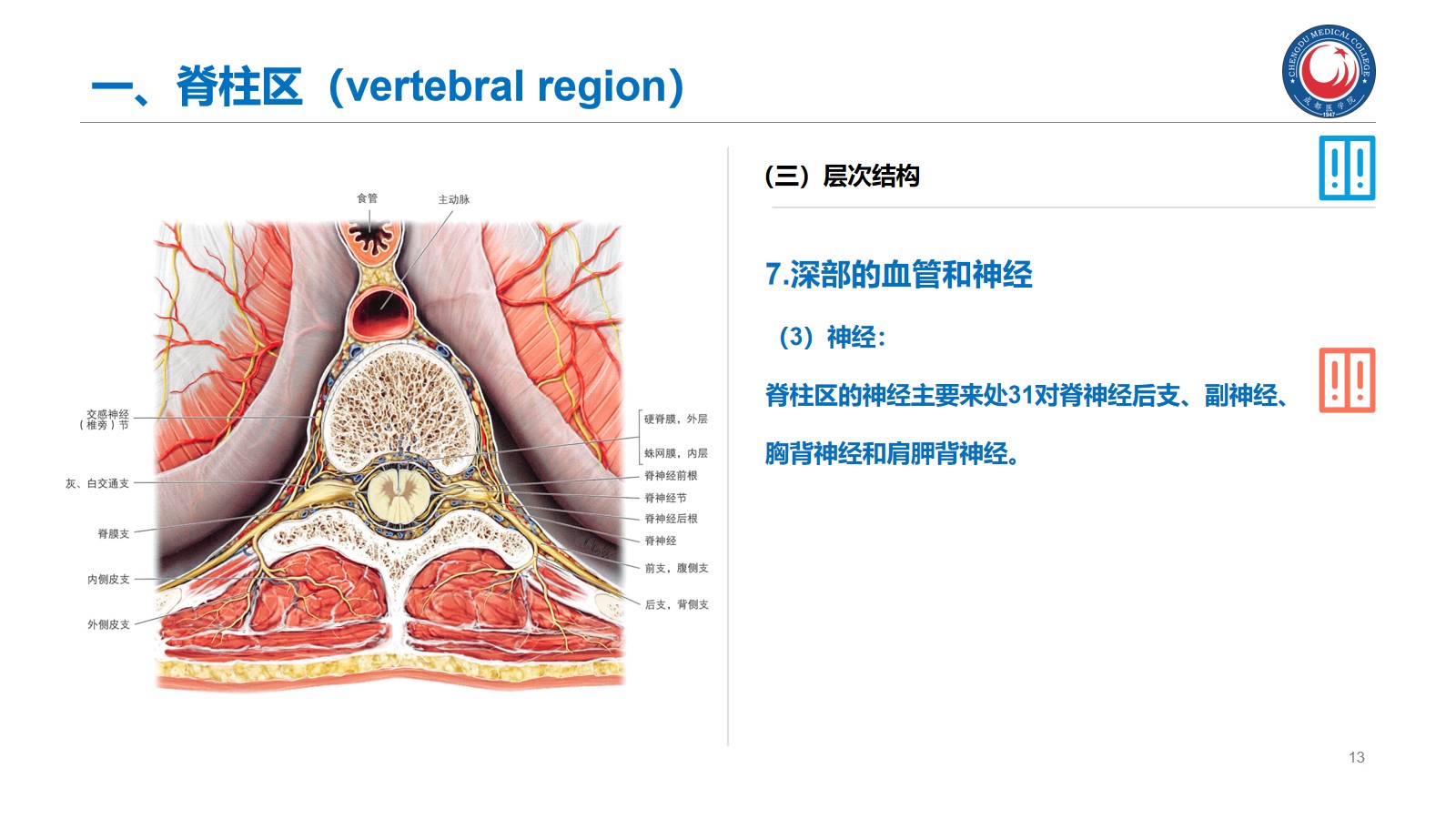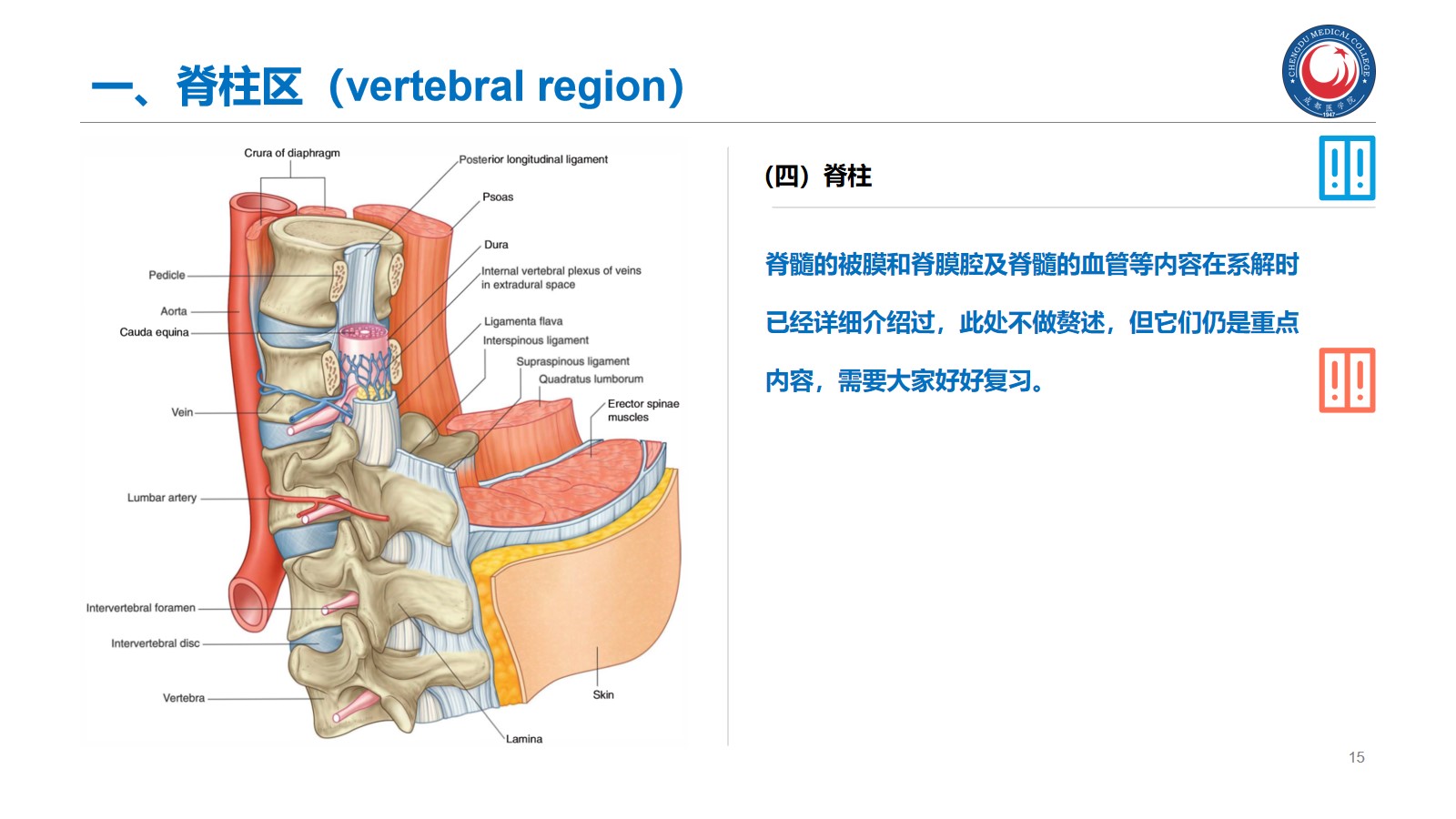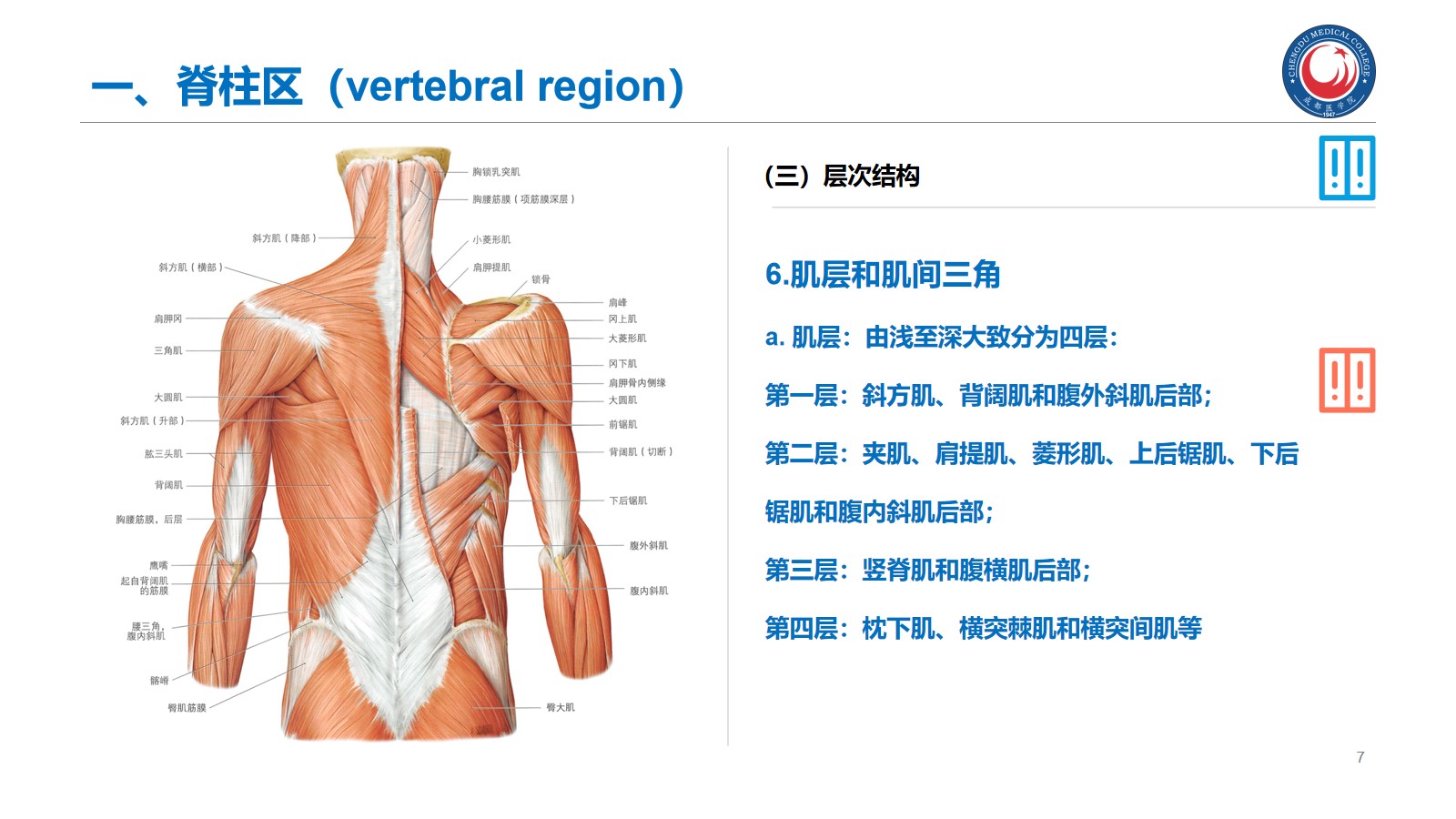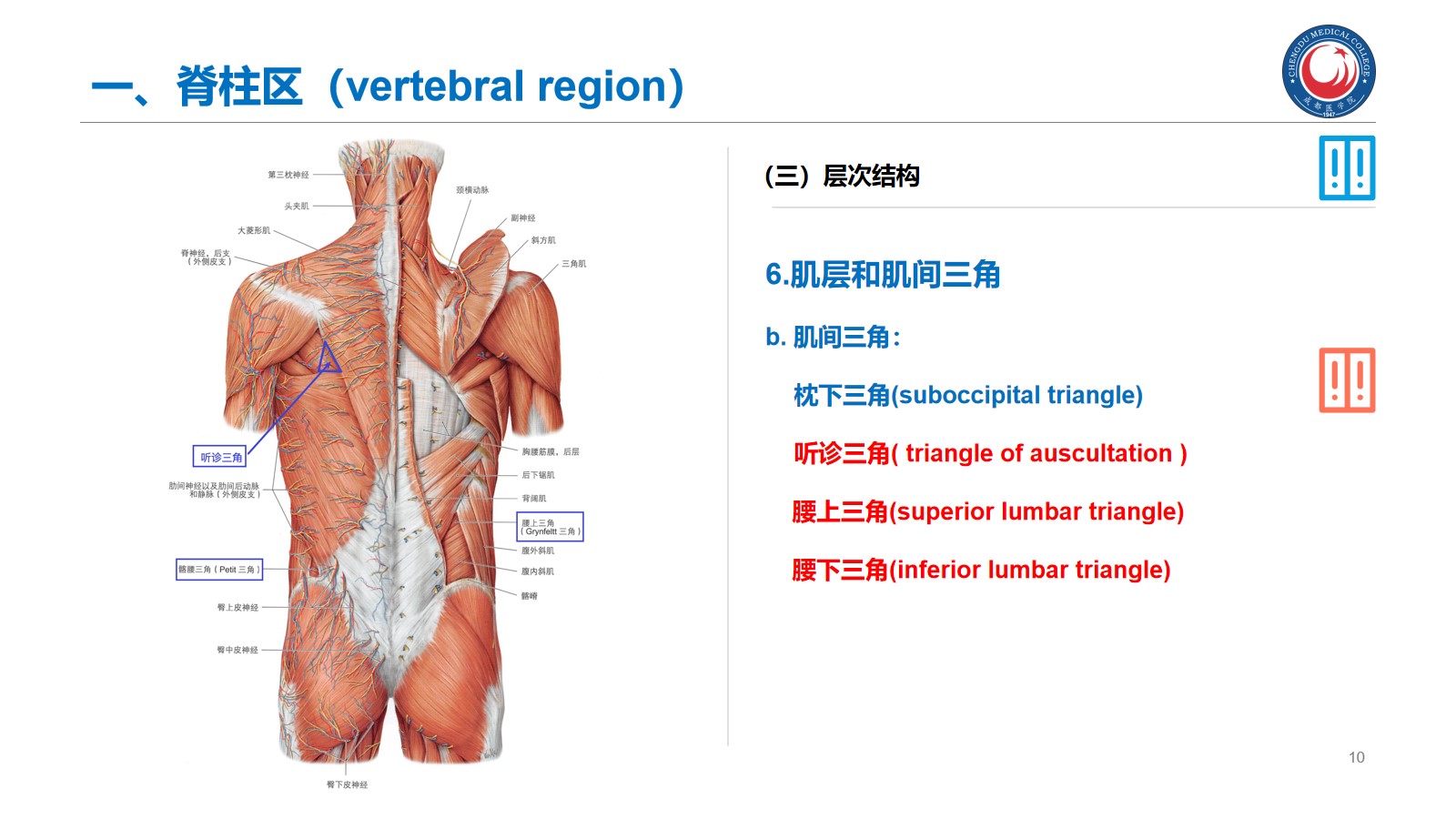 掌握:颈部的表面解剖、颈筋膜间隙及交通。颈部浅静脉的特点及其临床意义,颈动脉三角的境界、层次,颈动脉鞘的构成、内容及毗邻关系。甲状腺形态、位置、毗邻、血供及与神经支配的关系。