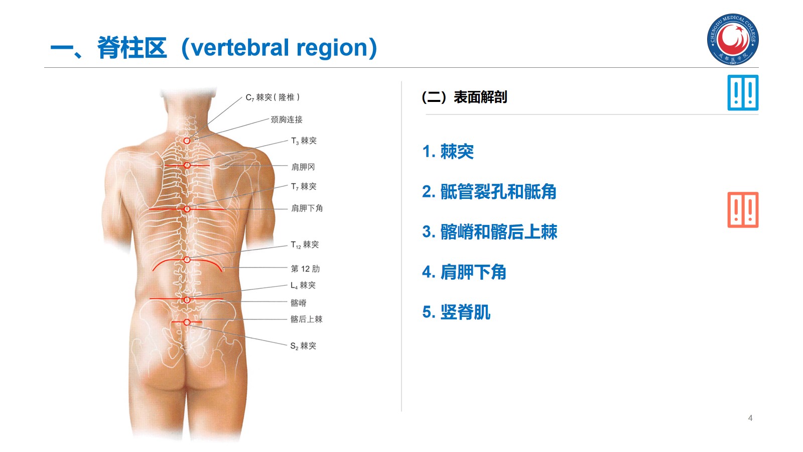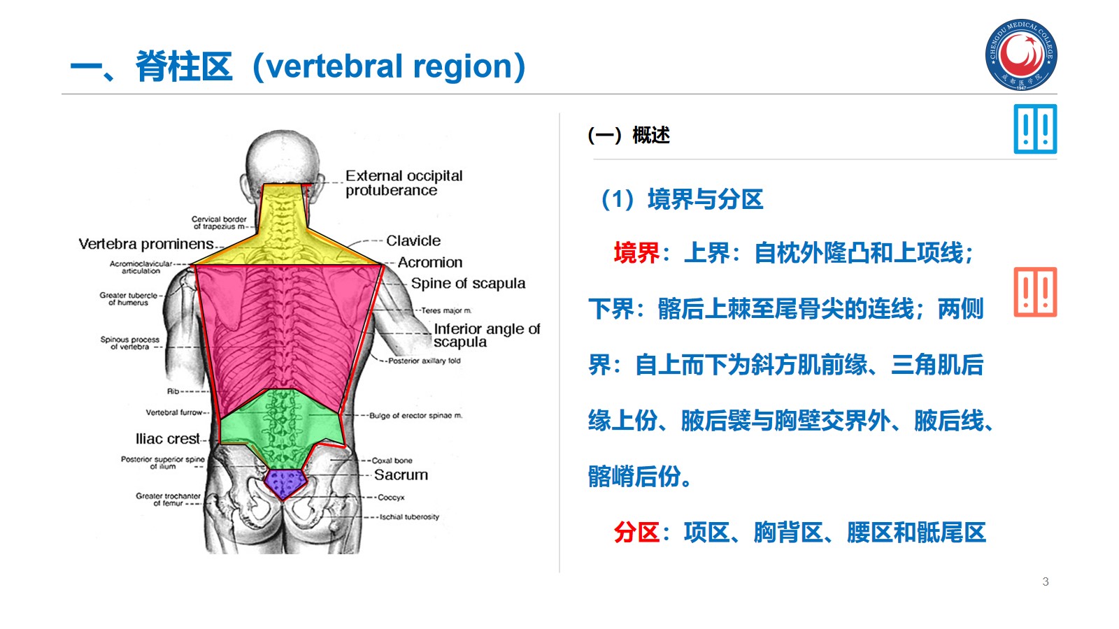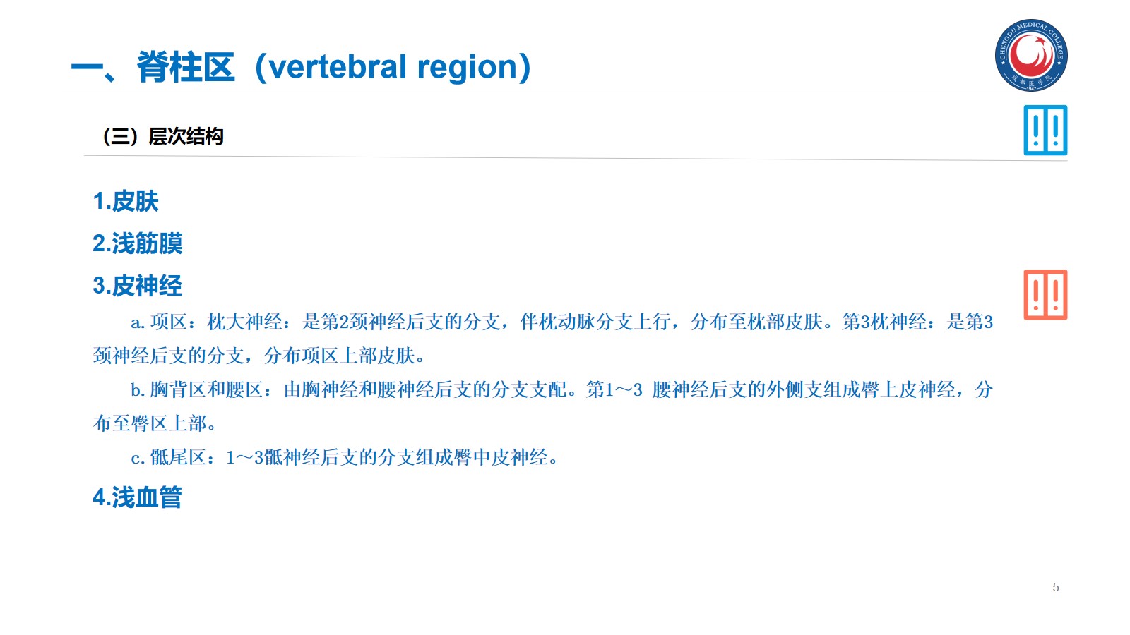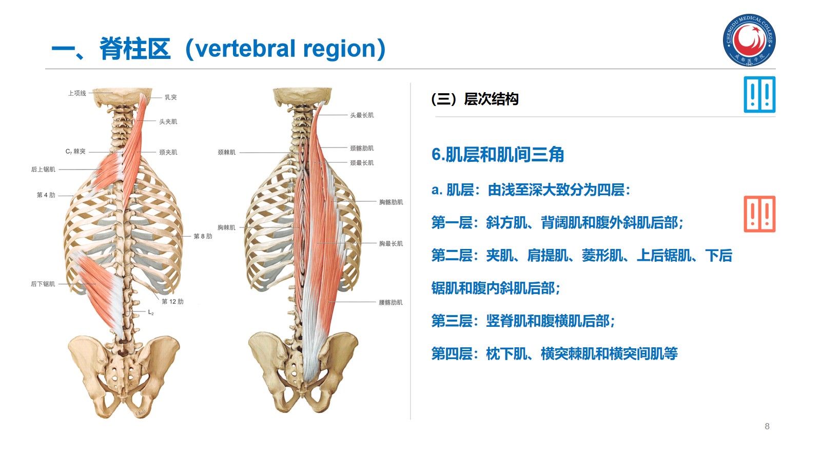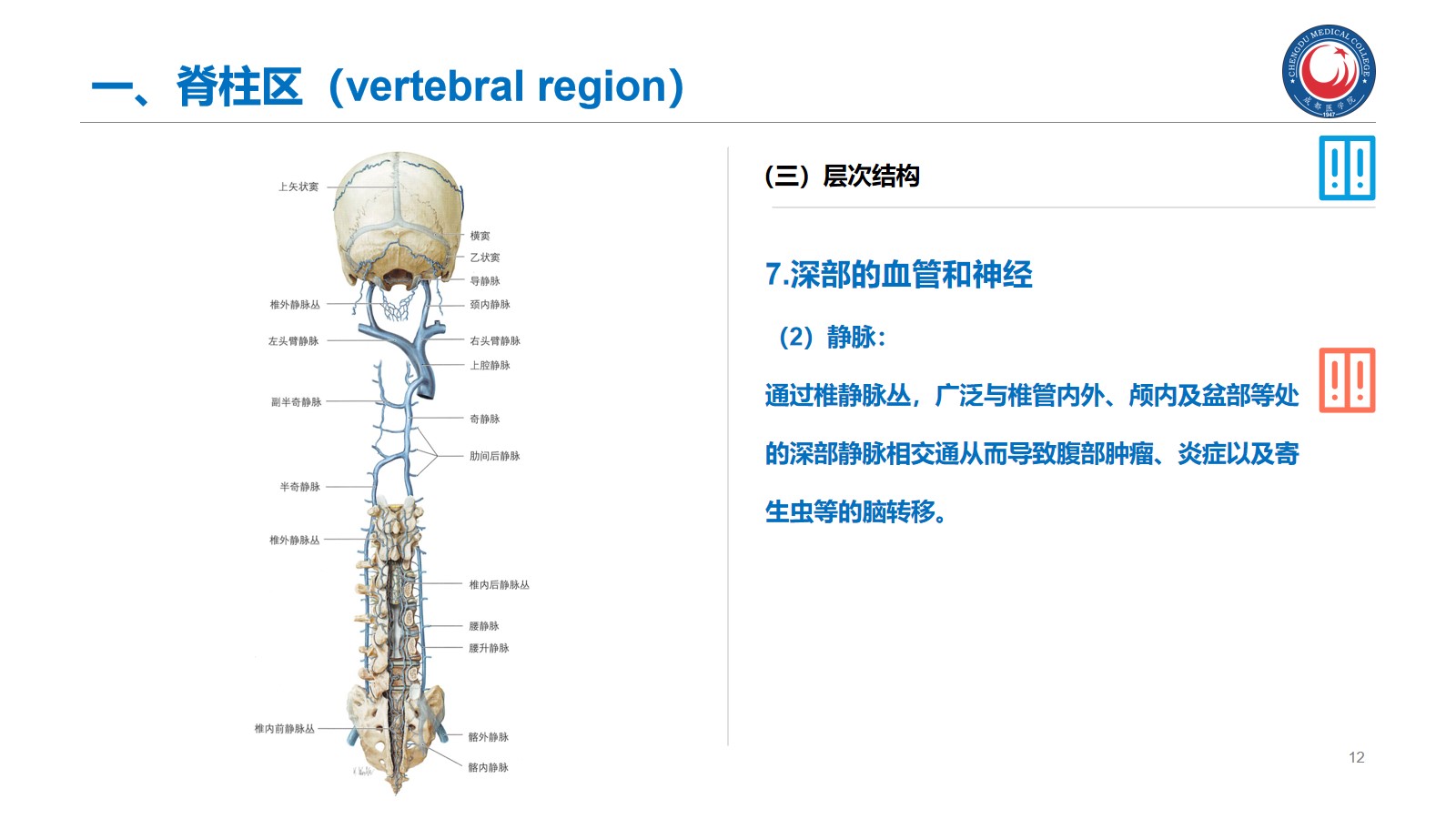 掌握:颈部的表面解剖、颈筋膜间隙及交通。颈部浅静脉的特点及其临床意义,颈动脉三角的境界、层次,颈动脉鞘的构成、内容及毗邻关系。甲状腺形态、位置、毗邻、血供及与神经支配的关系。