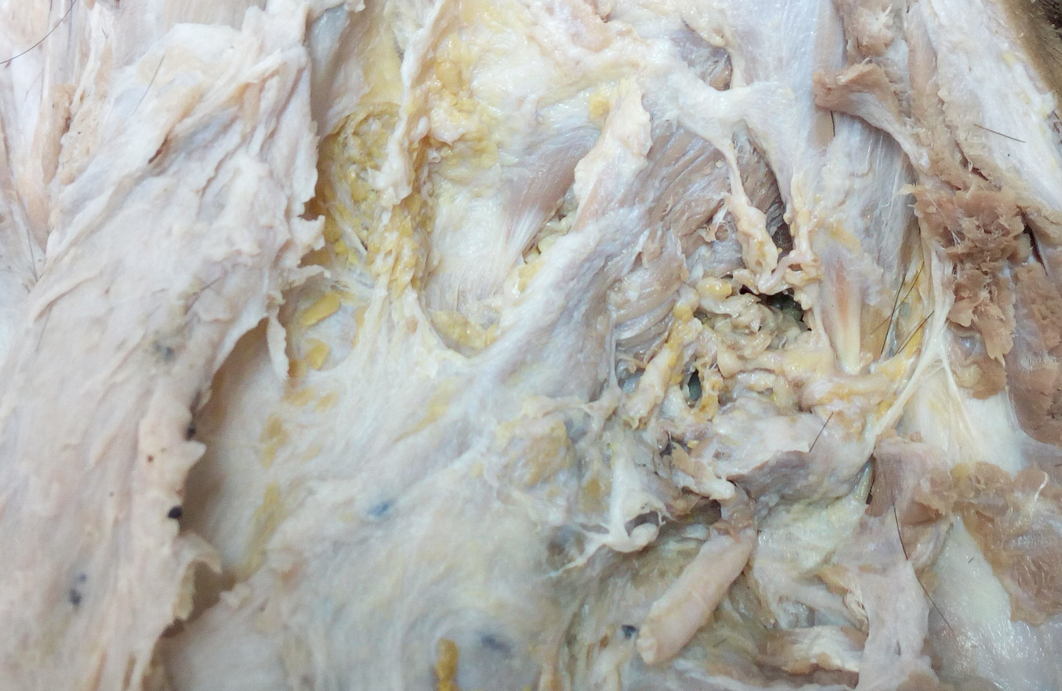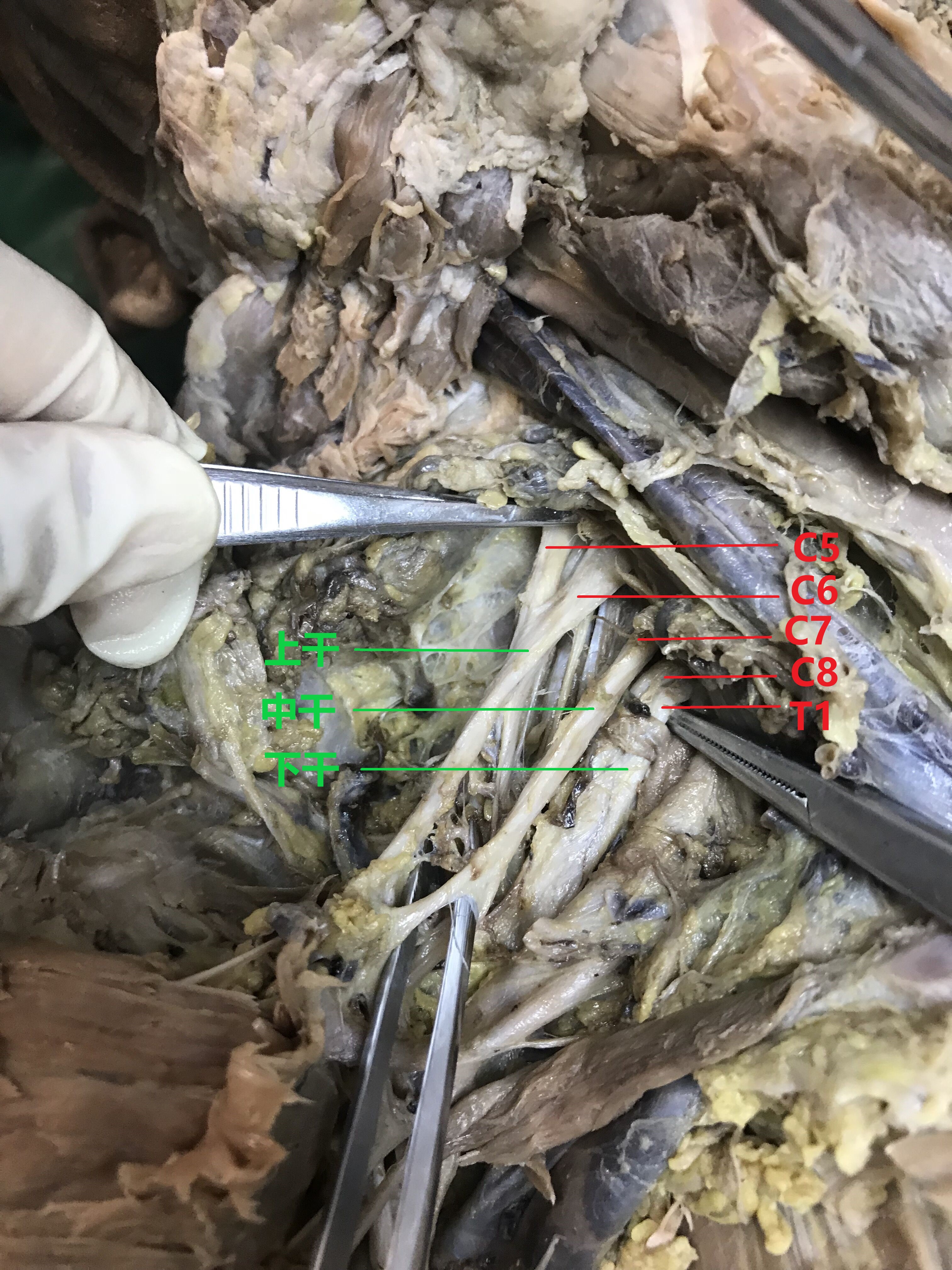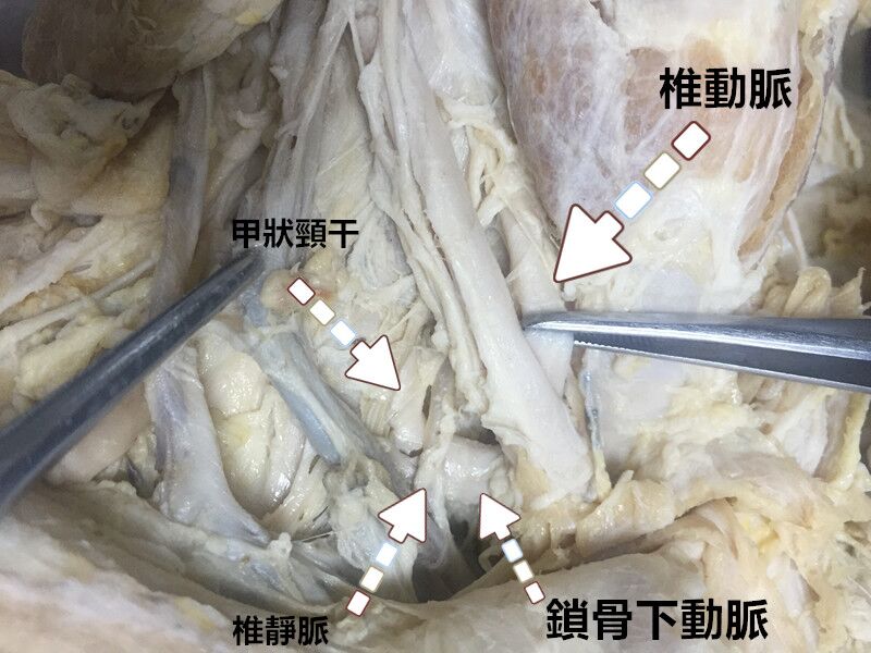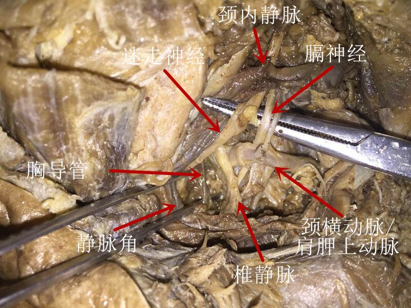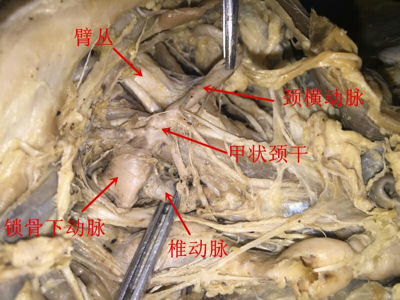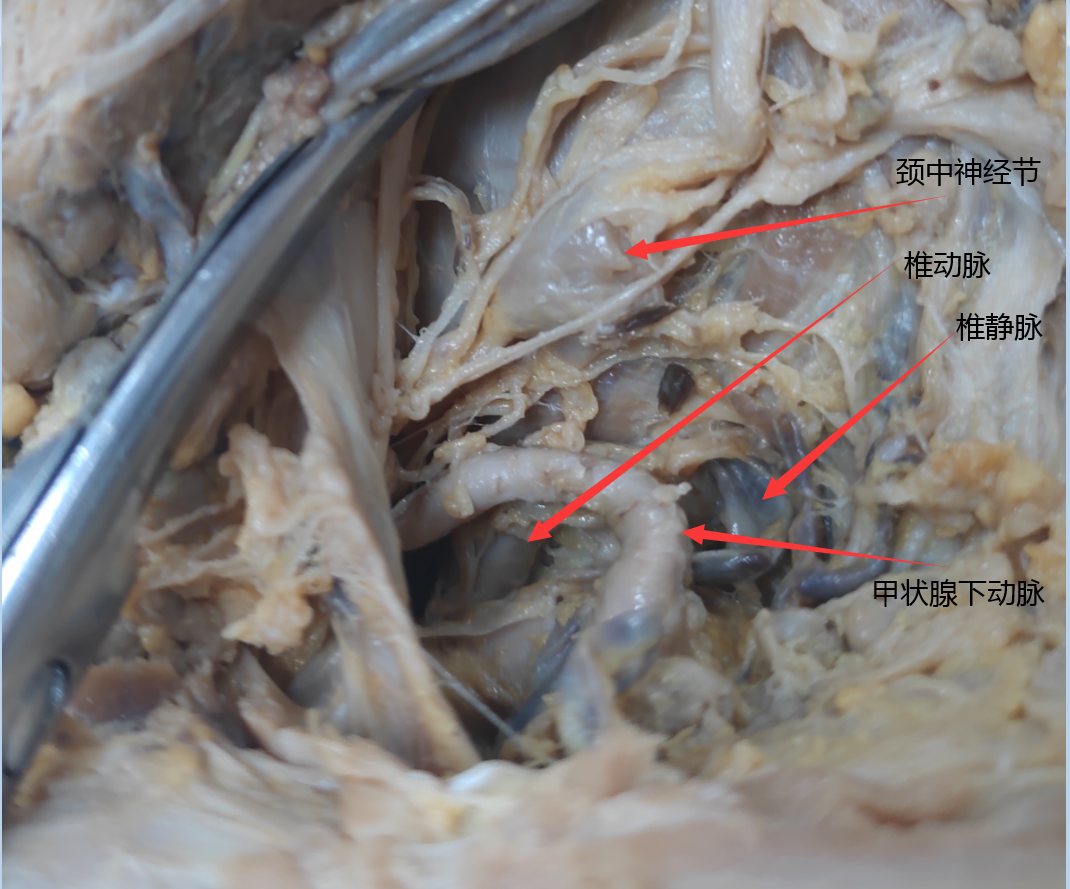 在前斜角肌的前方有纵行的膈神经、横行的锁骨下静脉和锁骨下动脉的两条分支,即肩胛上动脉和颈横动脉。两条动脉将膈神经紧紧缠绕并固定在前斜角肌表面。