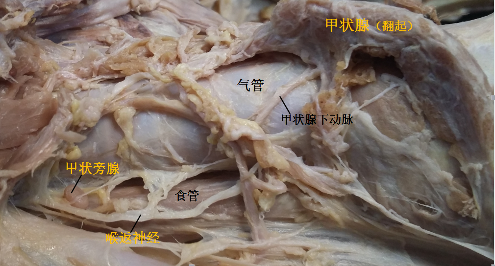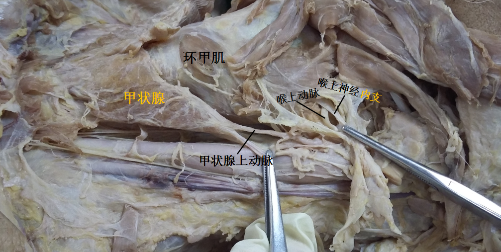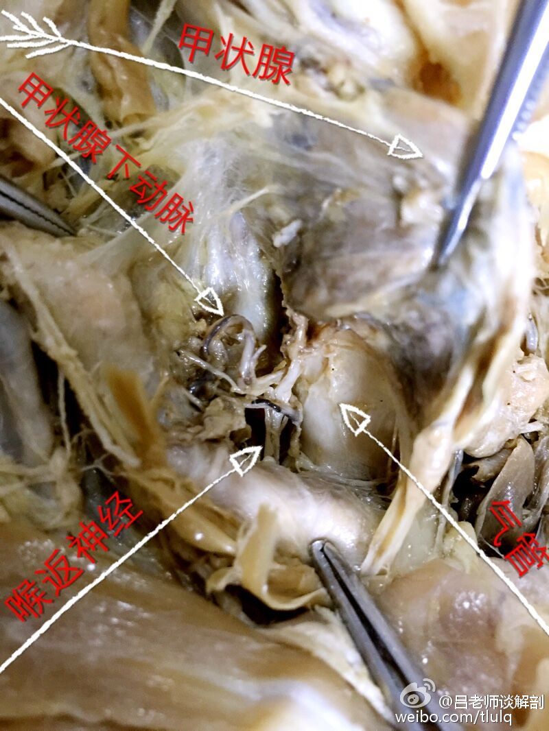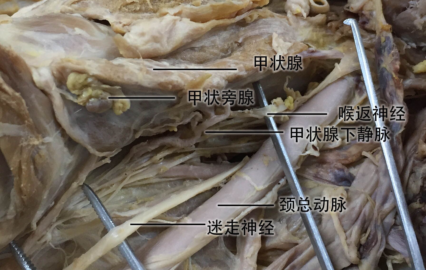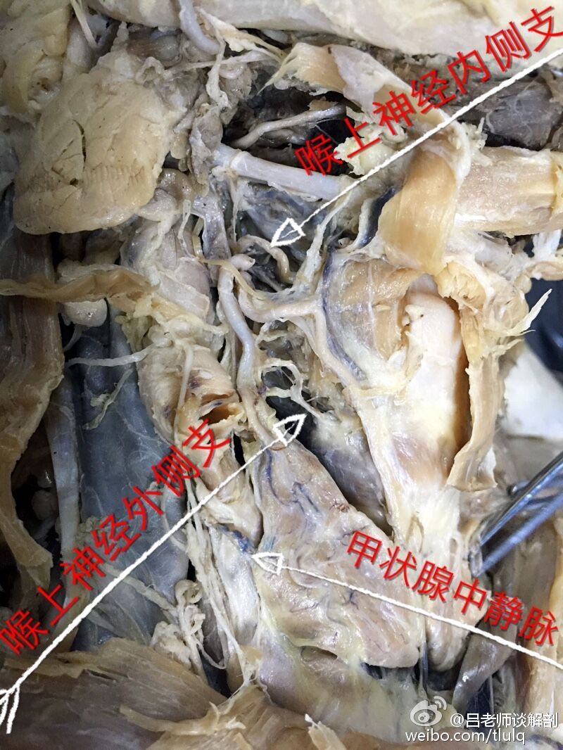 在甲状腺的上极,有甲状腺上动脉和喉上神经。神经位于血管的后内侧,近腺体处相分离;