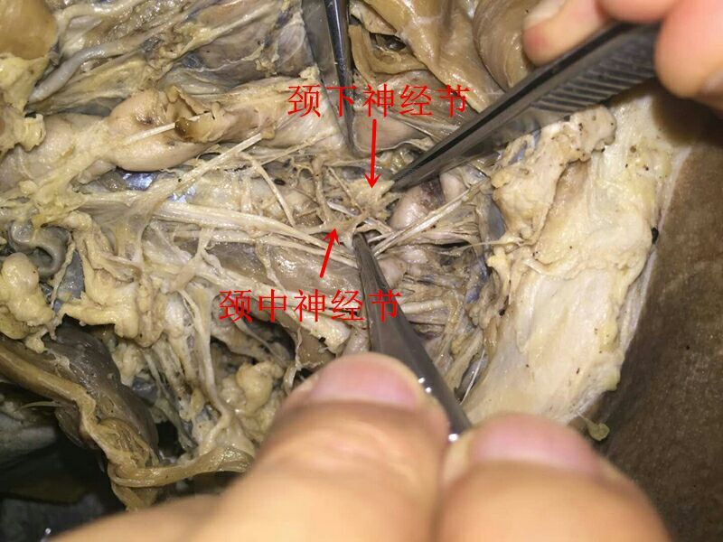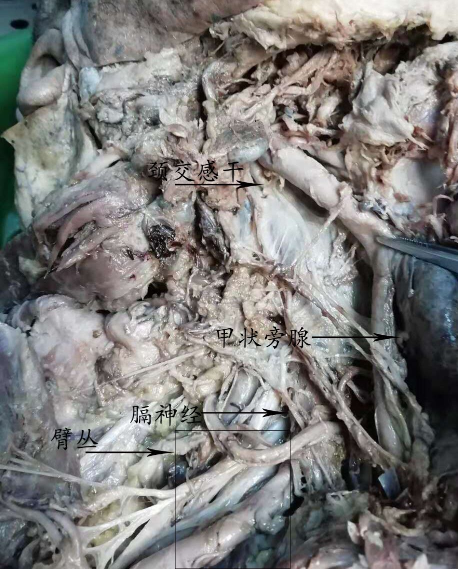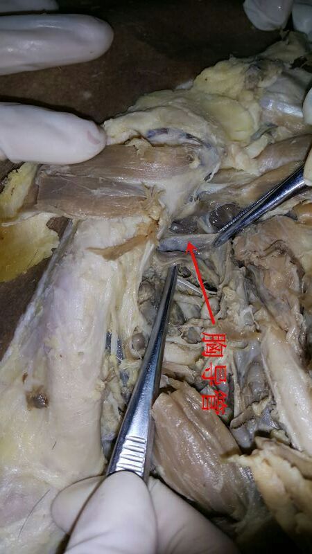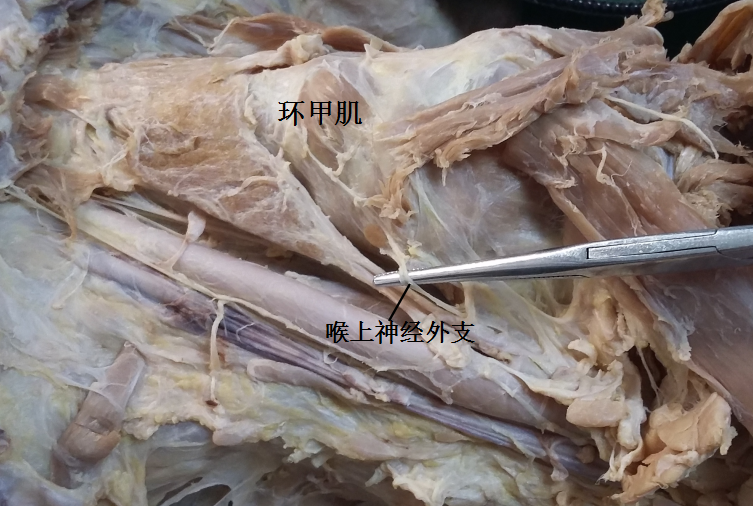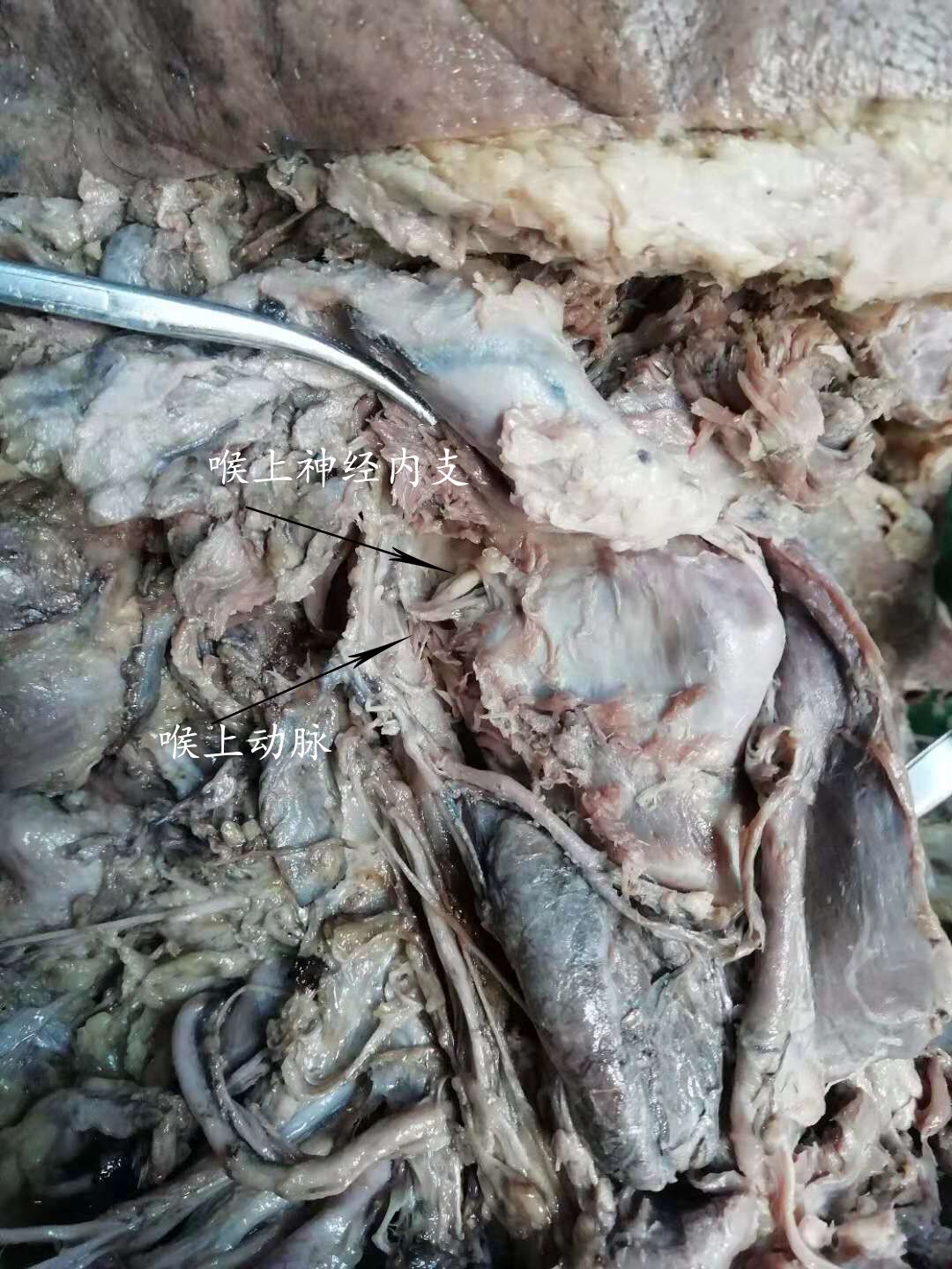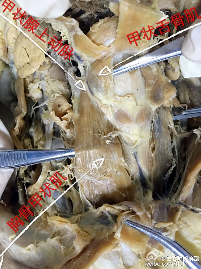 在甲状腺的上极,有甲状腺上动脉和喉上神经。神经位于血管的后内侧,近腺体处相分离;