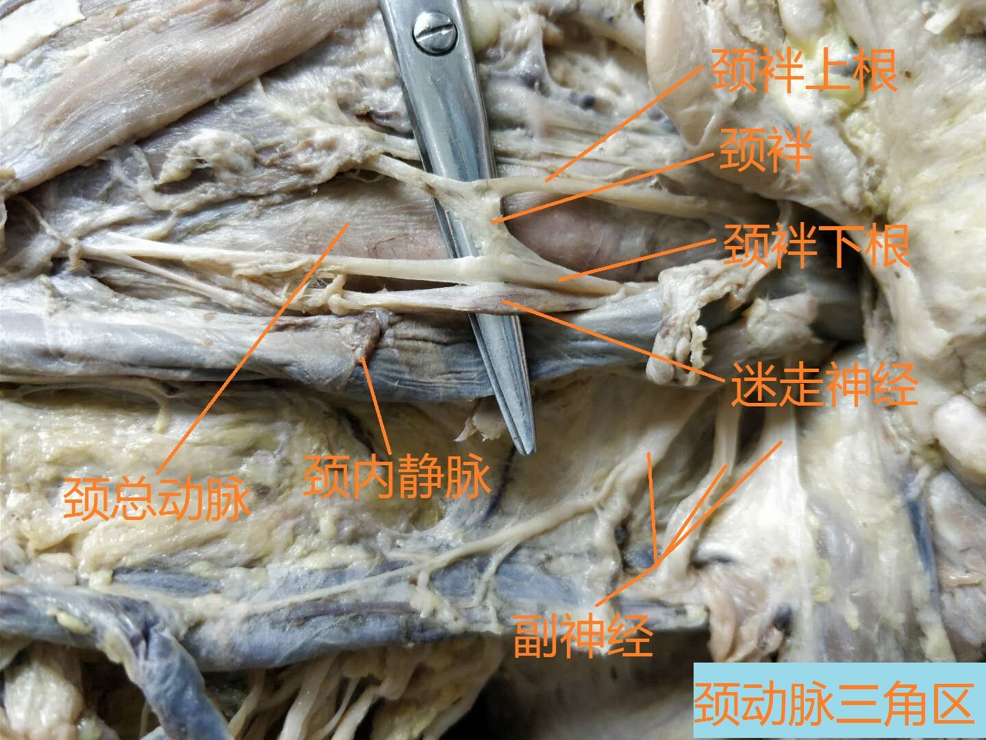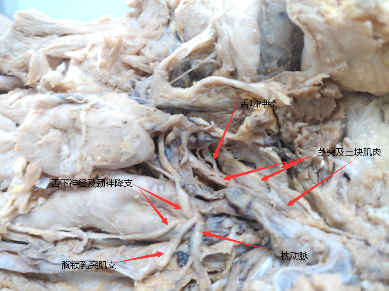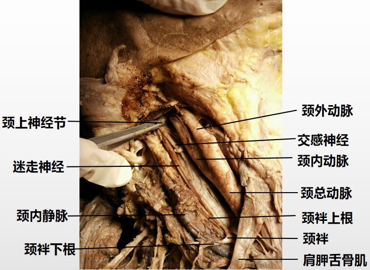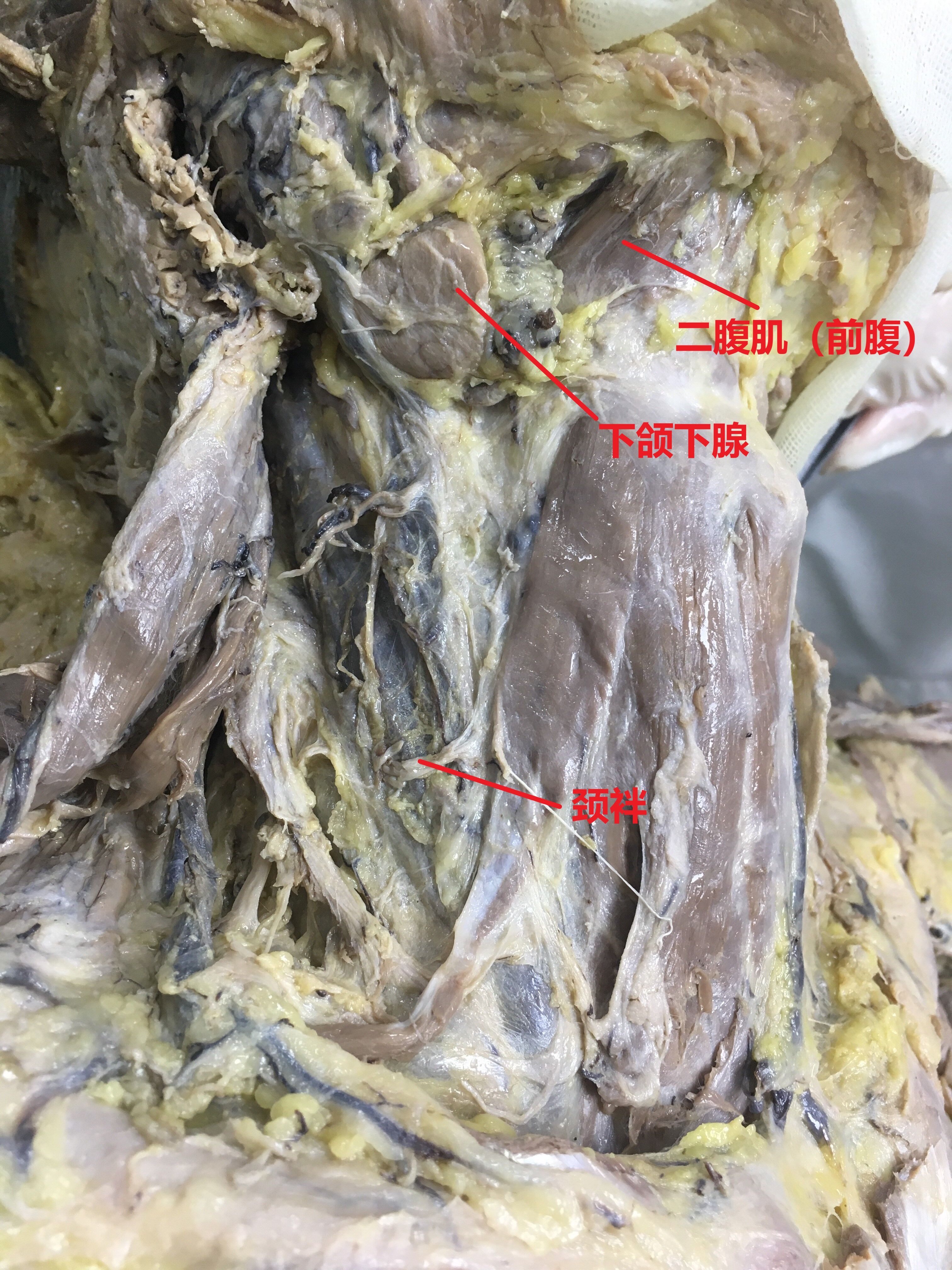 3条颈部大血管在二腹肌后腹的深面走行并列走行,自后分别为颈内静脉;颈内动脉和颈外动脉。