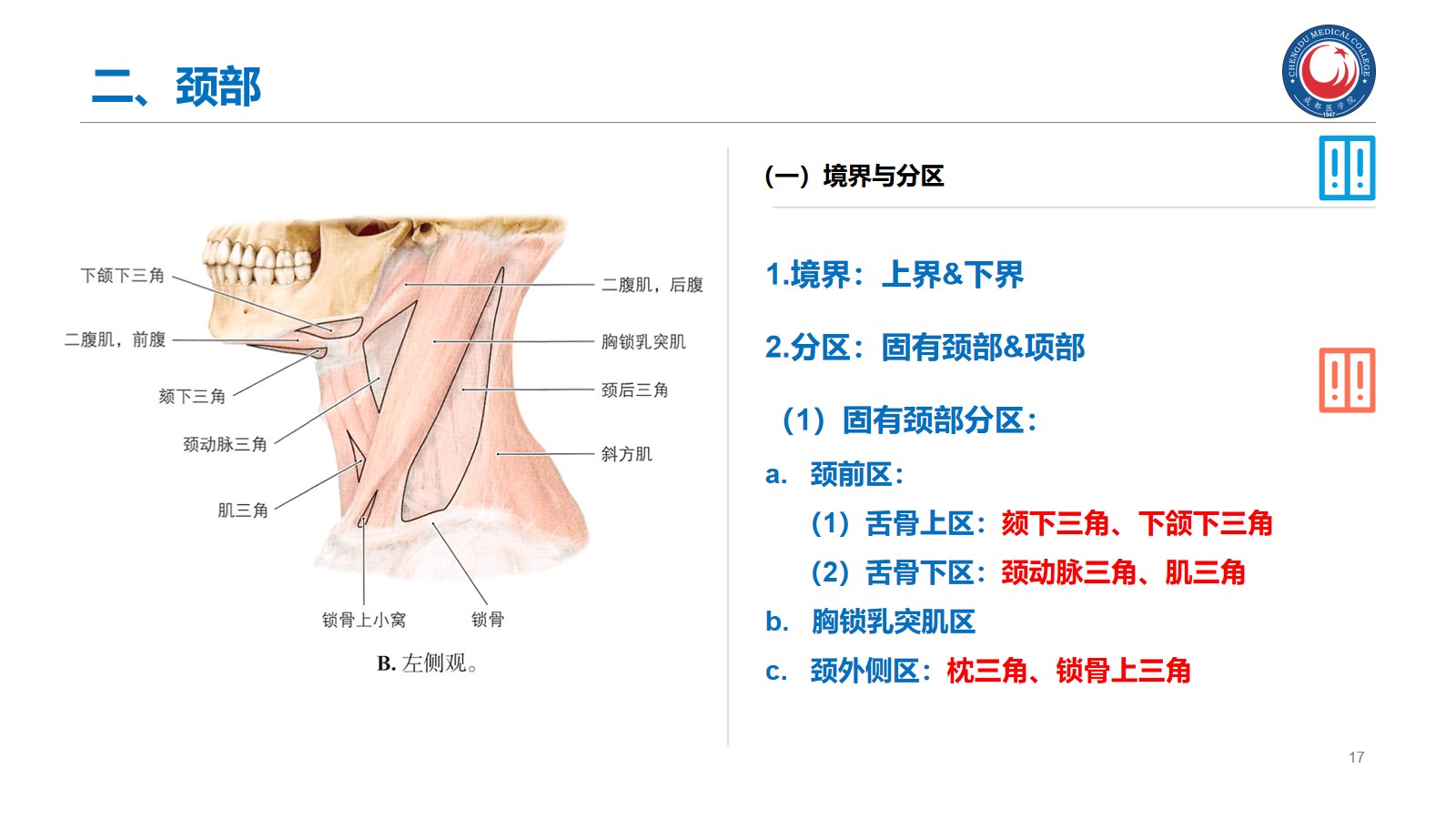 熟悉:颈部分区及各区的主要结构;气管颈段的毗邻关系及气管切开术的解剖要点。