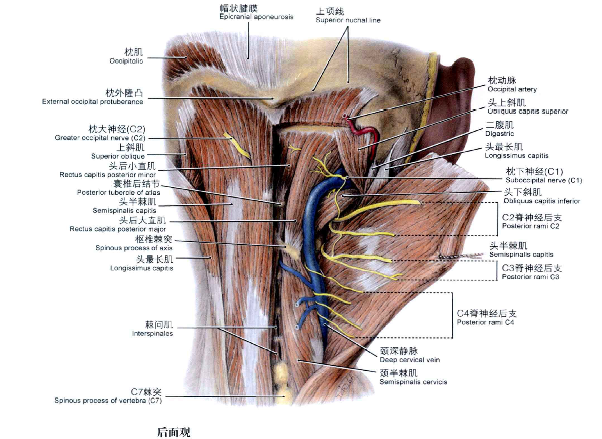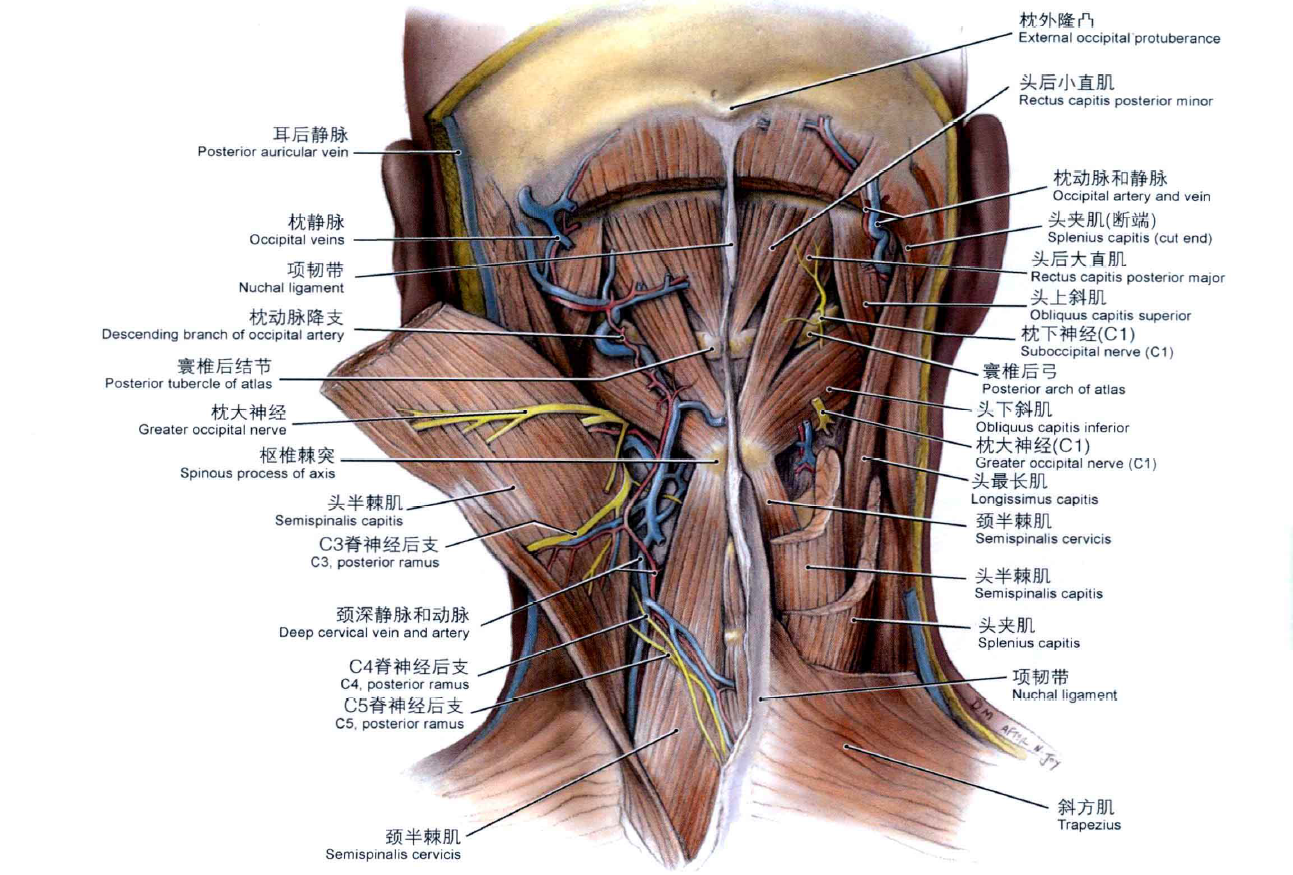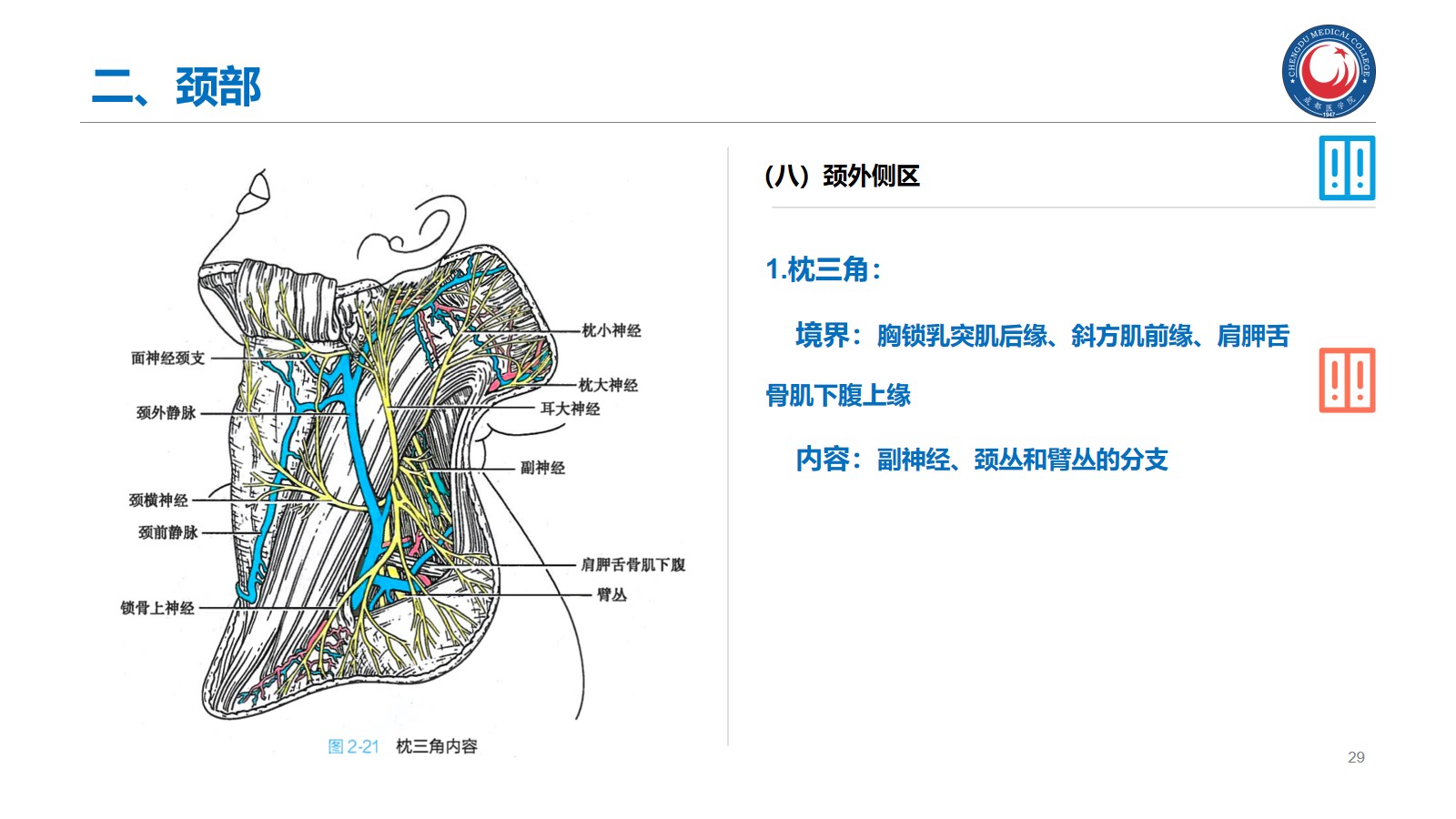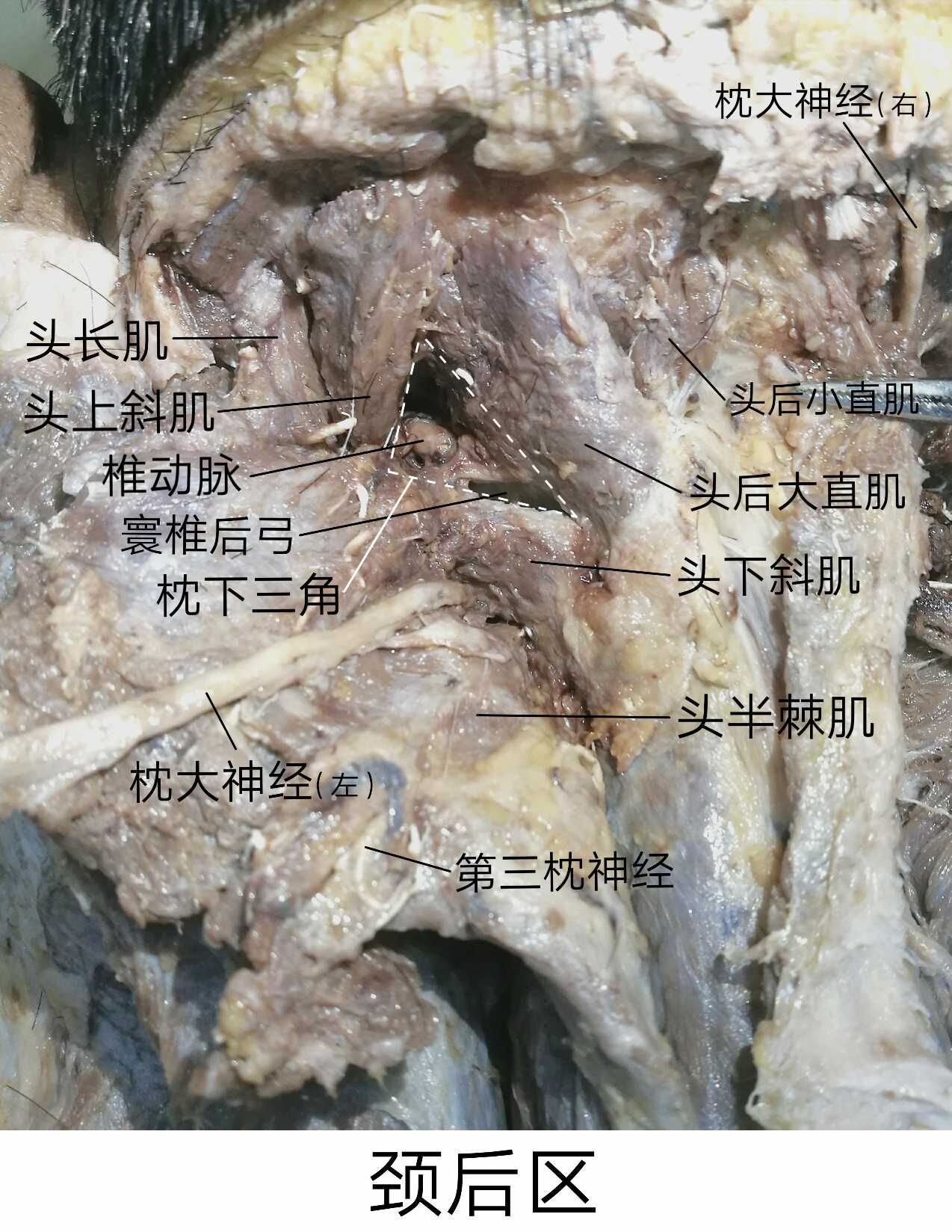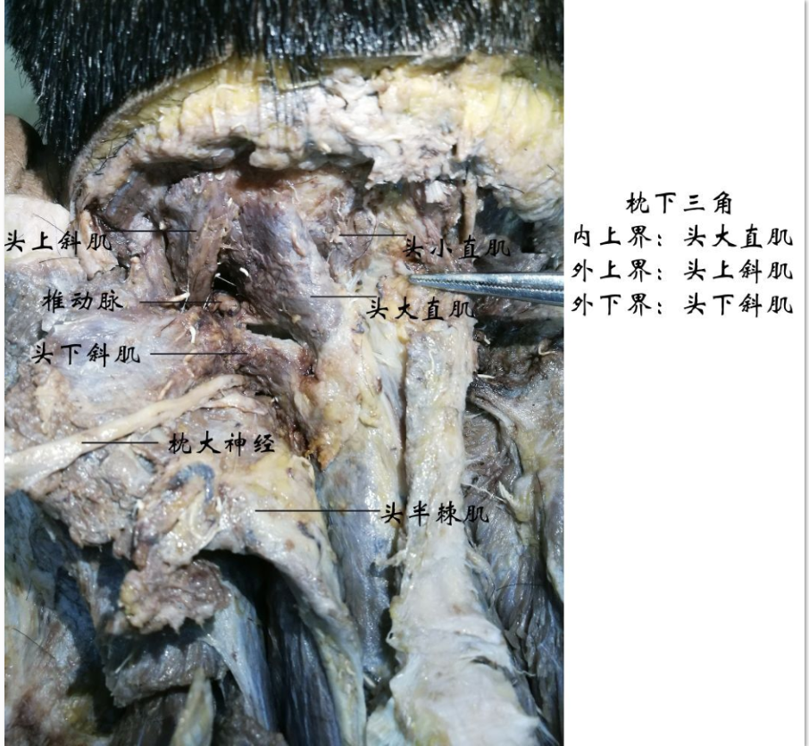 枕三角位于胸锁乳突肌、肩胛舌骨肌和斜方肌之间。内有副神经、颈丛皮神经和臂丛的分支。