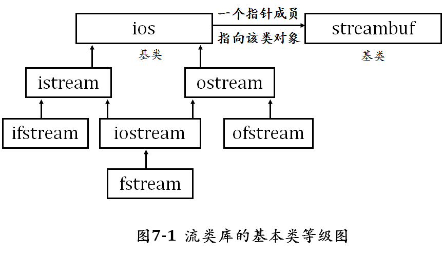 (2)图7-1是简化的流类库的基本类等级图,而不是直接的继承关系图。其实它们都是模板类,箭头表示的是类等级关系。