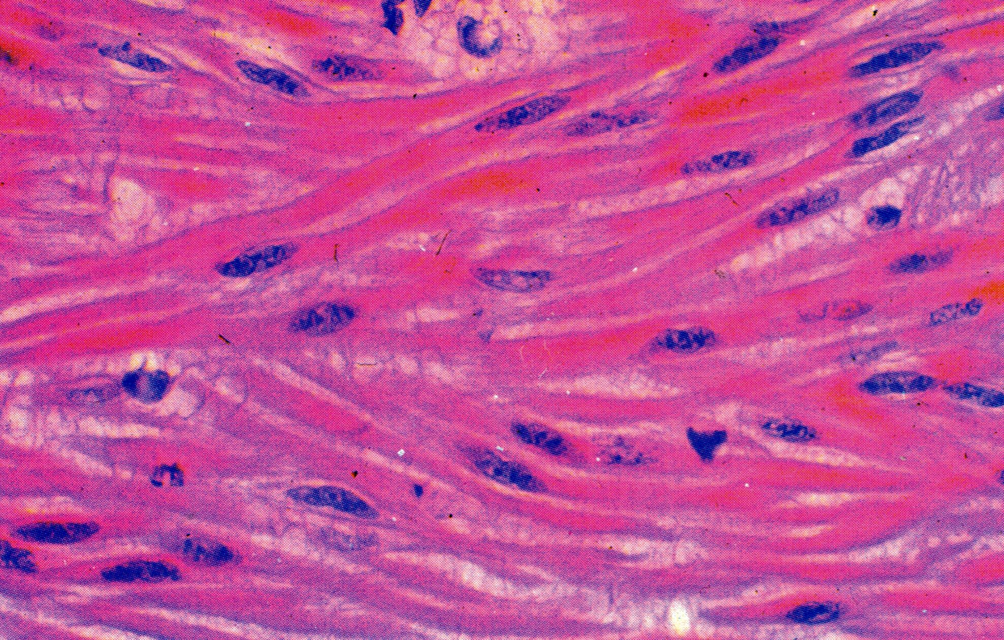 平滑肌纤维( smooth muscle fiber)纵切,肌纤维呈梭形,平行排列,相互错开。无横纹。核单个,椭圆形或呈长杆状,位于中央。肌纤维间的细丝(有的横过肌纤维)是缠绕在其表面的结缔组织纤维(网状纤维)。