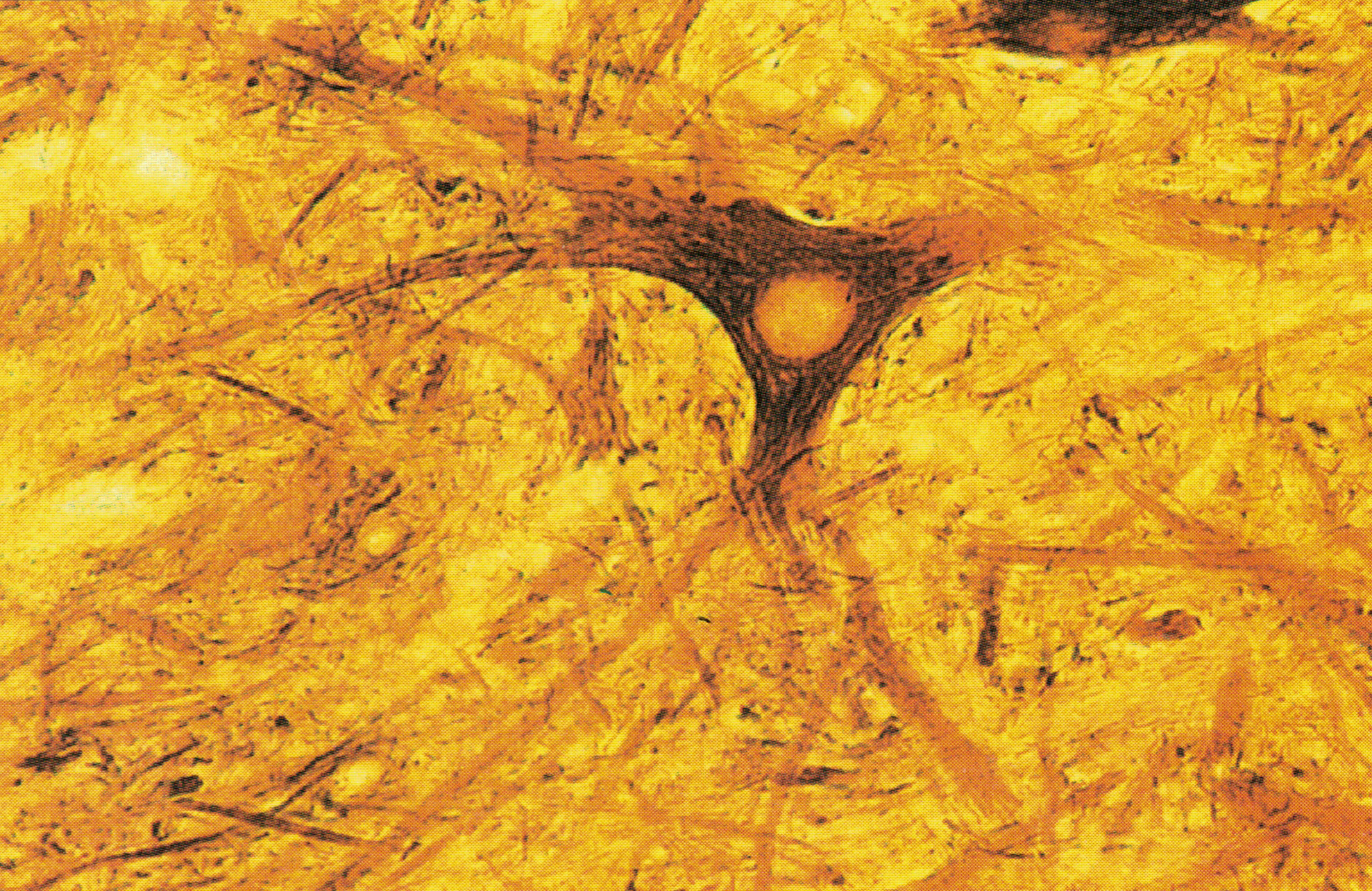 神经元胞体和突起染成棕褐色。图示前角内多突起的神经元,核大而圆,淡染。胞质内的神经原纤维( neurofibril)呈棕黑色细丝,从胞体延伸入树突和轴突内。神经原纤维是由细胞骨架(中间丝和微管)构成,与胞体和突起内物质运输有关。神经元胞体四周交织的索状结构为其他神经元突起。