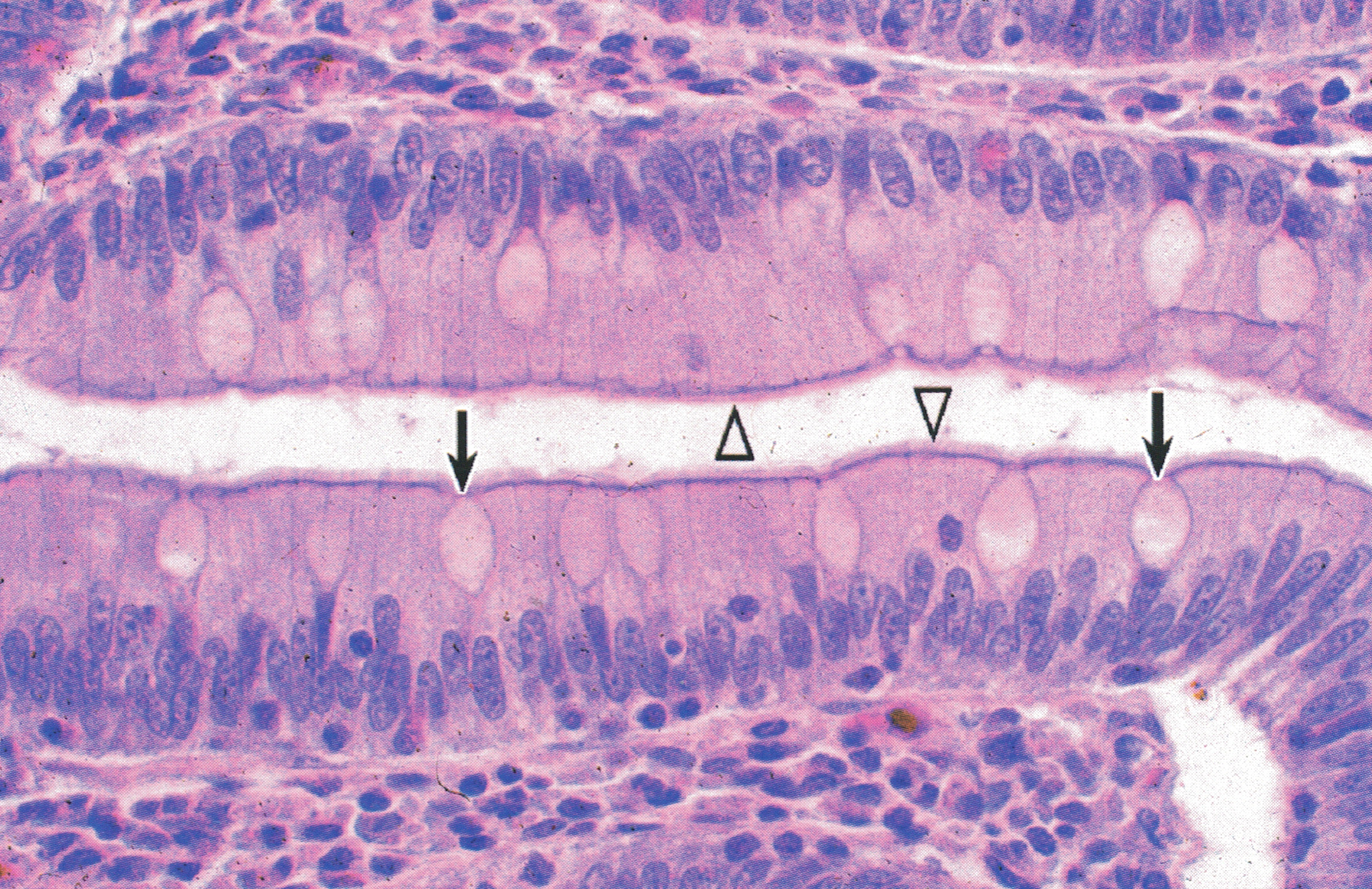 有髓神经纤维纵切。坐骨神经主要由有髓神经纤维( myeli-nated nerve fiber)组成,每条神经纤维由神经元轴突(axon)及其外包的施万细胞( Schwann cell)形成的髓鞘(myelin sheath)构成。郎氏结(  Ranvier node)处的结构较清晰(↑),可见一条深染的轴突穿行于中央,轴突外面的髓鞘脂类物质被溶解而呈空白区,扁平的施万细胞核位居纤维的周边(△)。郎氏结是两个施万细胞相邻接处,此处无髓鞘而呈缩窄状。