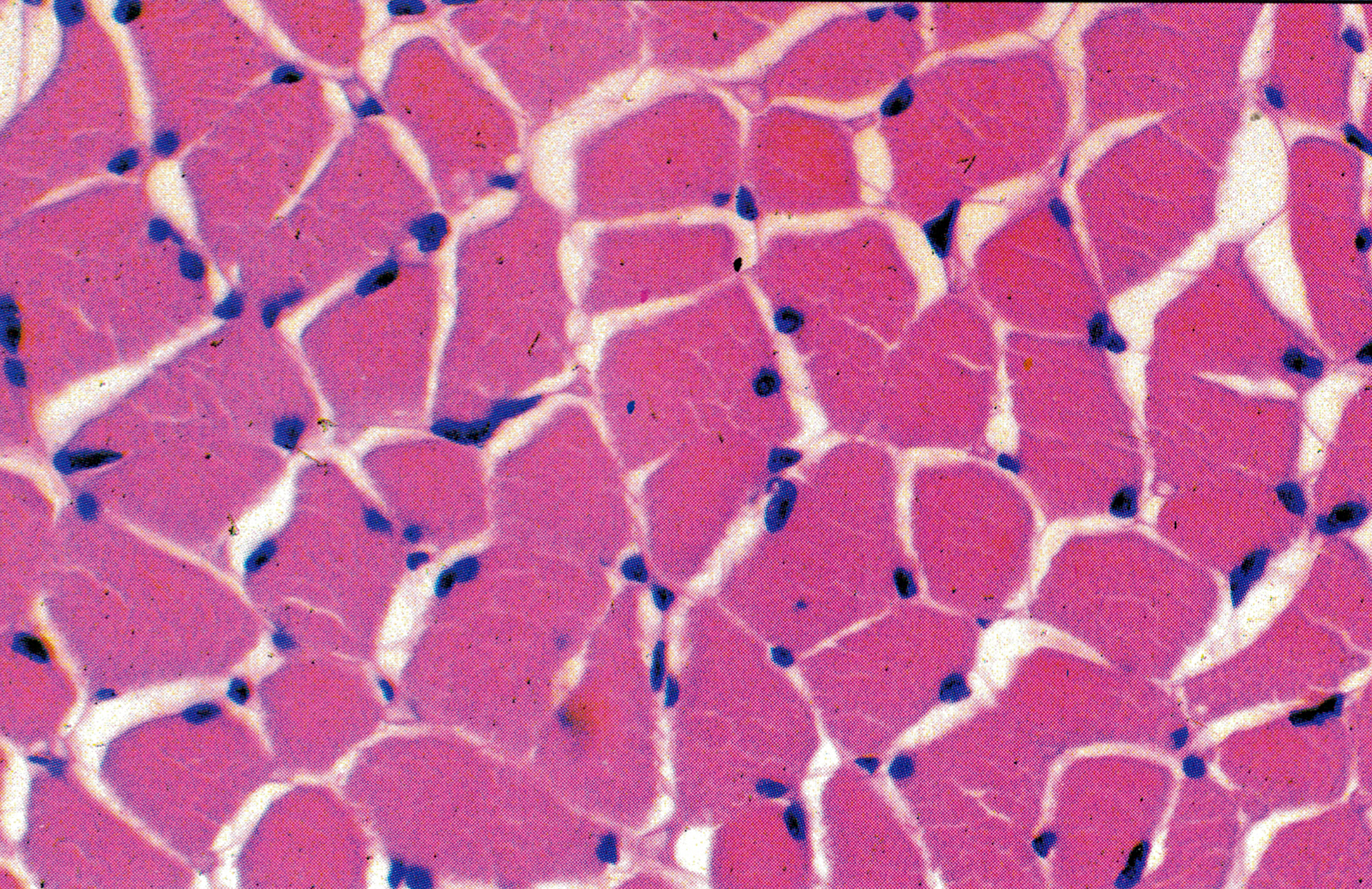 骨骼肌纤维横切面,呈不同形状的块状,核位于边缘。胞质内的肌原纤维(横切)被肌浆( sar-coplasm)分隔成小束,称孔海姆区(Cohnheim field)。