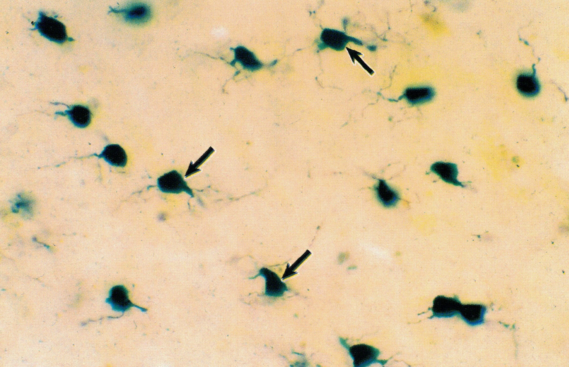 少突胶质细胞( oligodendrocyte)染成黑色。胞体近圆形,突起少而短,分支也少(↑)。少突胶质细胞的突起包卷神经元轴突并形成髓鞘,故它是中枢神经系统内的髓鞘形成细胞。