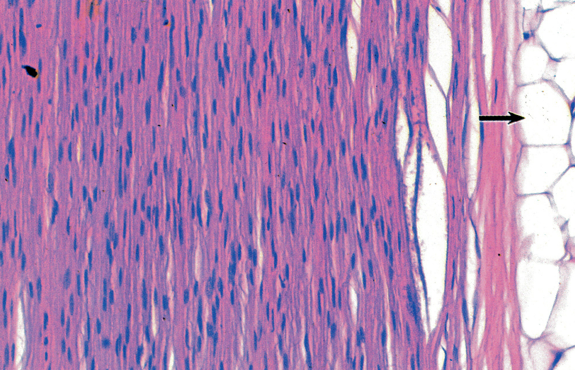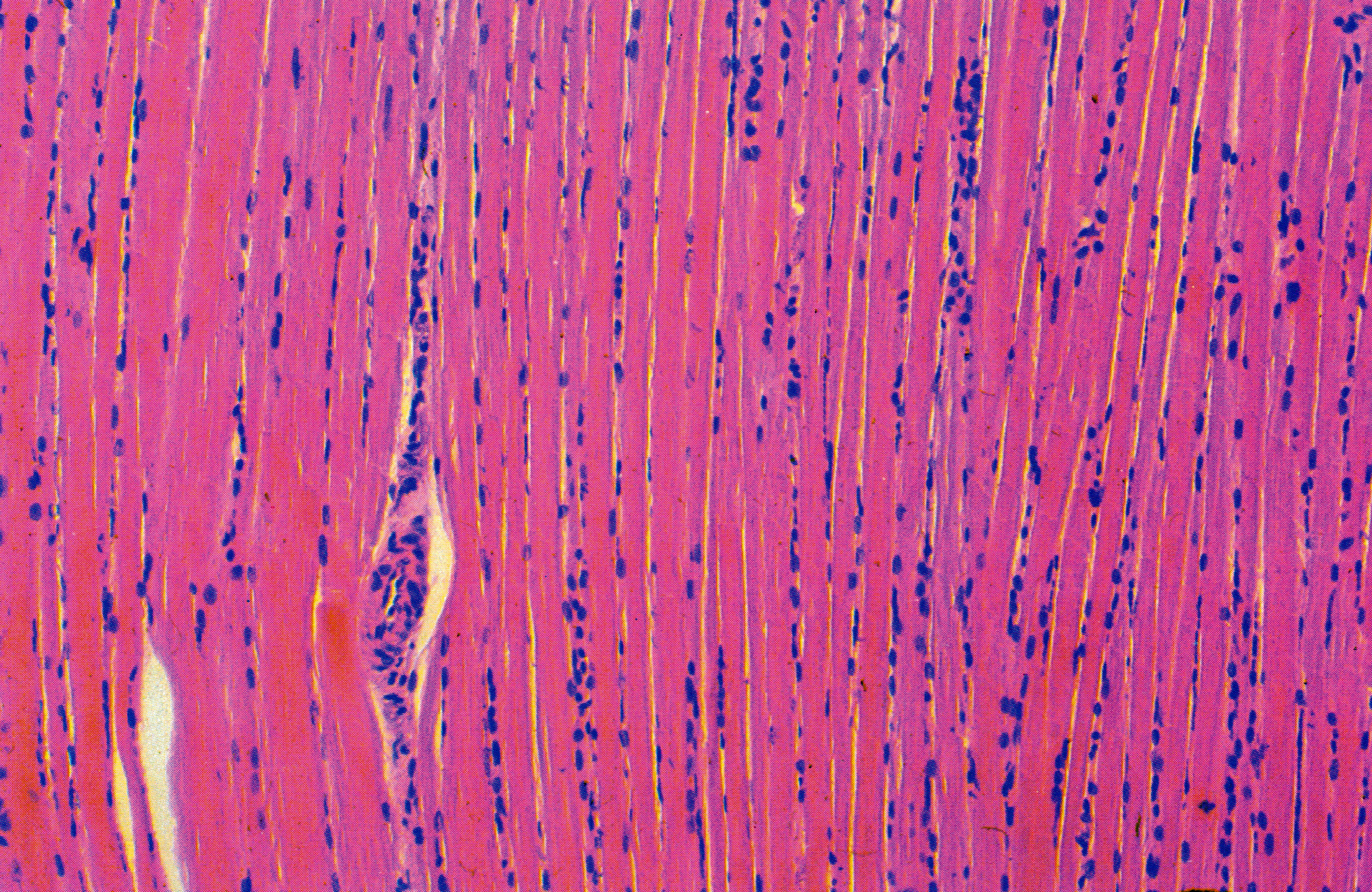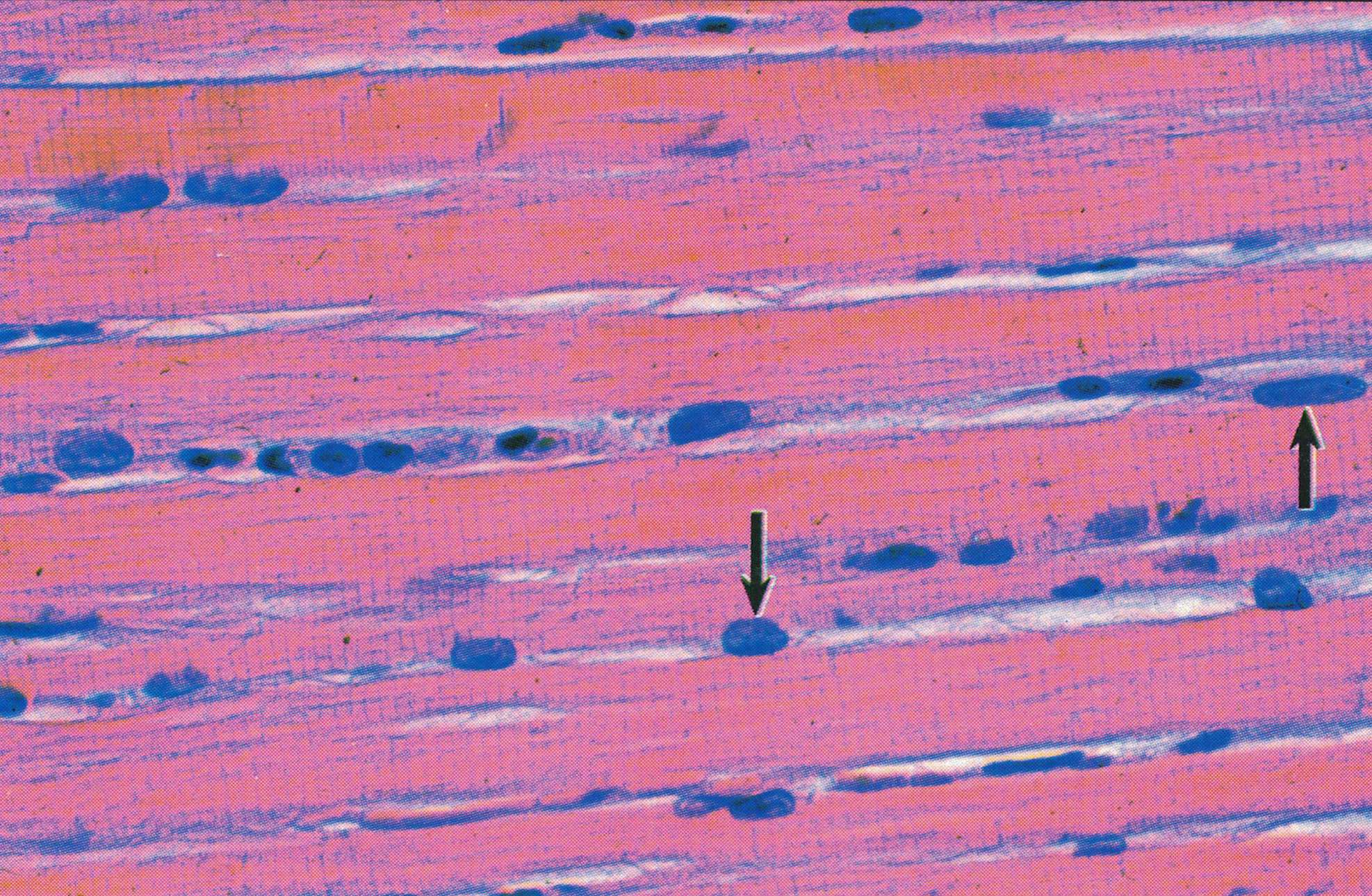 骨骼肌纤维纵切,纤维形似长带状,核卵圆形,数量多,位于肌膜下(↑)。由肌丝组成的肌原纤维(myofibril)沿肌纤维长轴平行排列,具规律的明暗相间的横纹。
