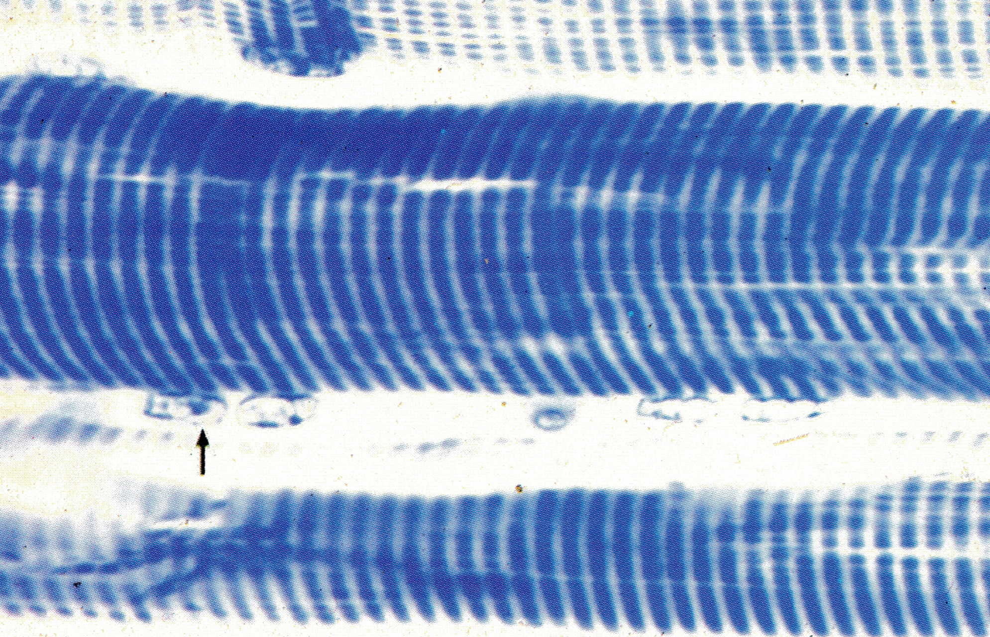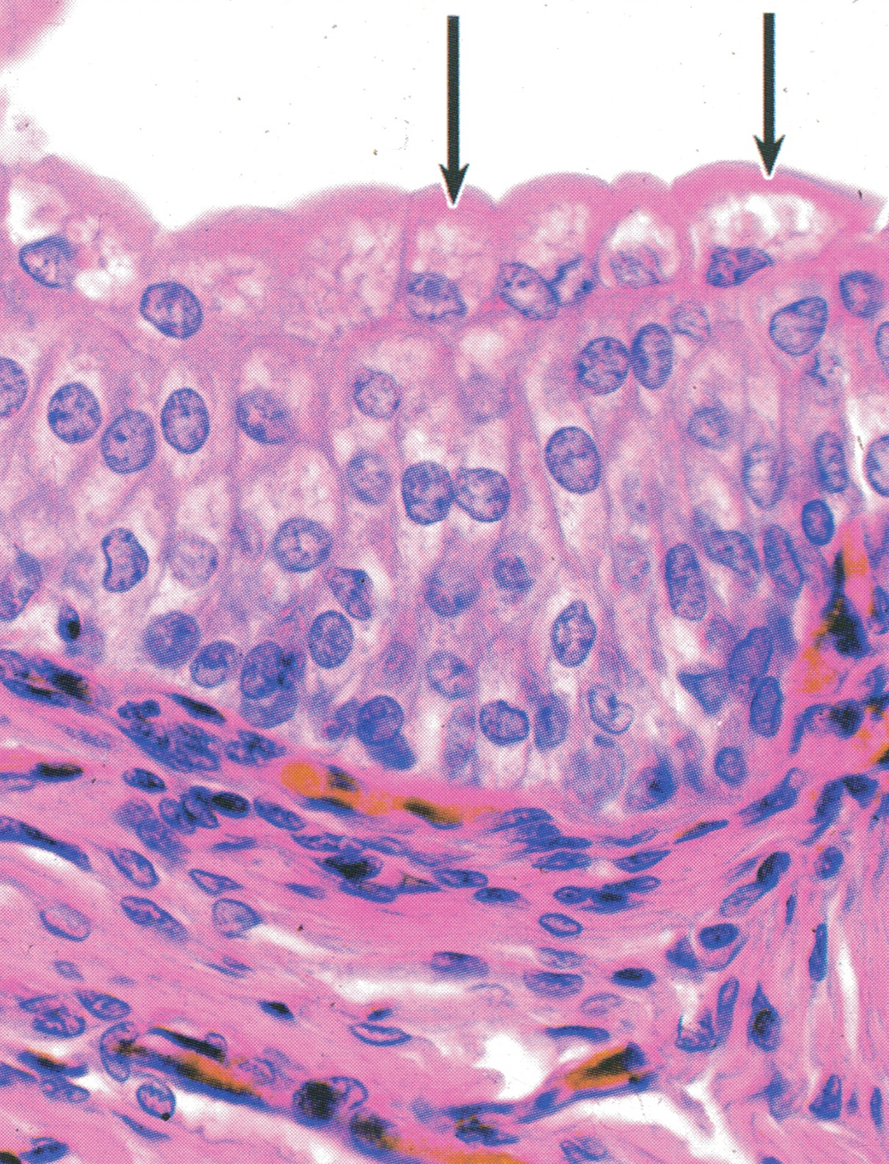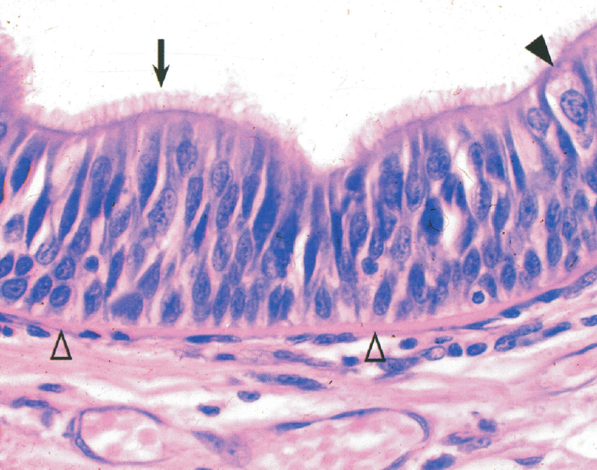 骨骼肌纤维纵切,纤维形似长带状,核卵圆形,数量多,位于肌膜下(↑)。由肌丝组成的肌原纤维(myofibril)沿肌纤维长轴平行排列,具规律的明暗相间的横纹。