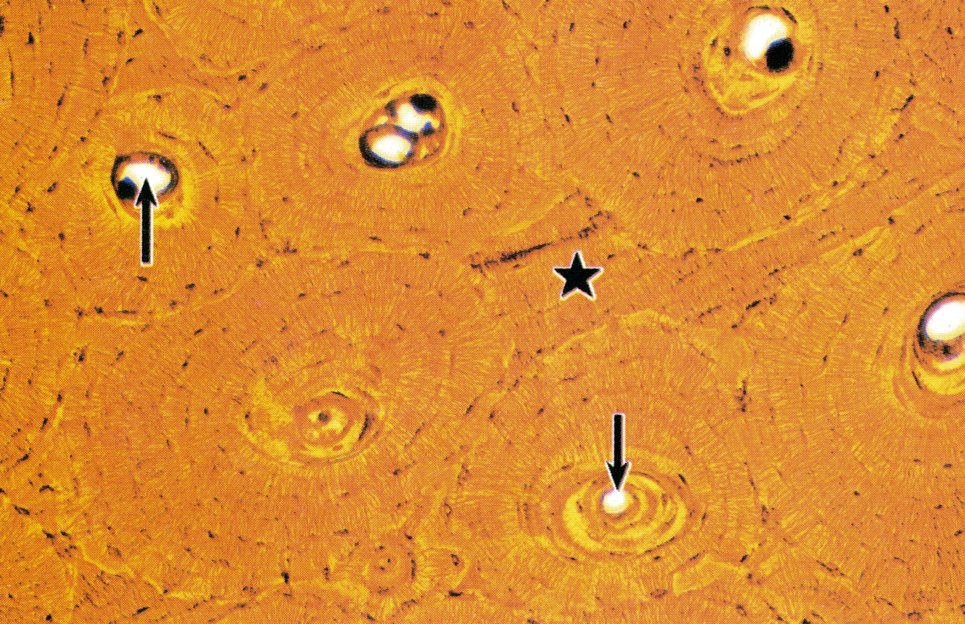 骨单位的横断面呈圆形,中央管(↓)内含的血管、淋巴管、神经及骨膜组织等已难辨认。多层环形骨板沿中央管呈同心圆排列,呈黑色的骨陷窝也呈环形排列,在骨陷窝之间呈放射状的细管为骨小管。骨单位之间的不规则形的骨组织为间骨板( interstitial lamella)(★)。骨单位是长骨干起支持作用的主要结构单位。
