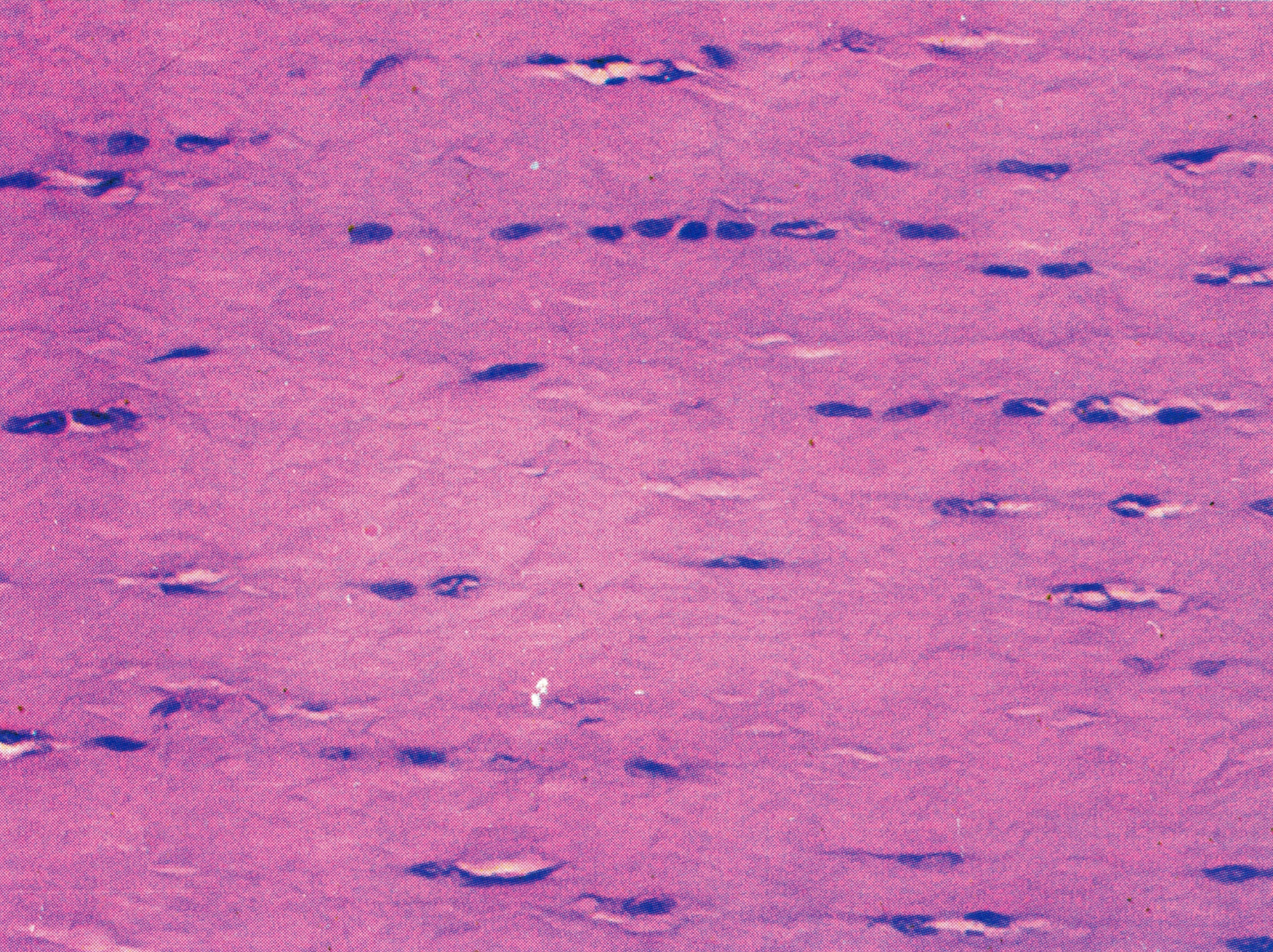 大量胶原纤维束密集平行排列,基质很少,细胞也较少。细胞位于纤维之间,呈扁平状,有突起,称腱细胞,是一种成纤维细胞。肌腱和腱膜的纤维顺受力方向平行排列,起牢固的连接作用。