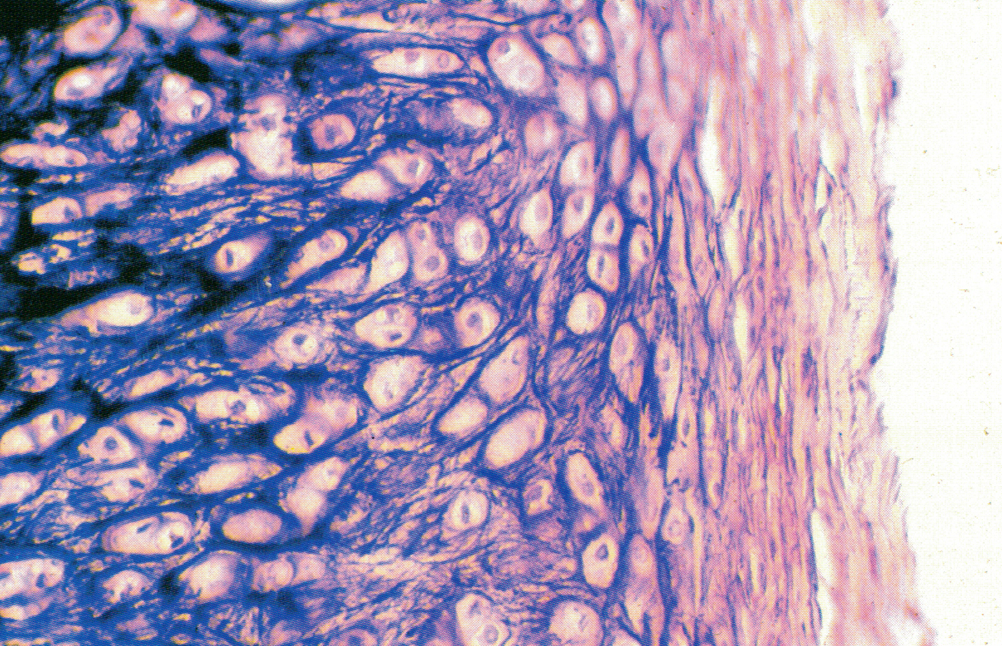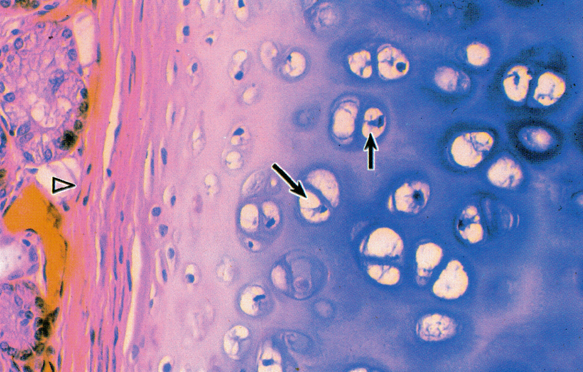 透明软骨( hyaline cartilage)是分布较广泛的一种软骨。图一侧为软骨膜( perichondrium)(△),软骨膜与软骨组织之间呈逐渐演变的过程。近软骨膜处的软骨细胞( chondrocyte)较小,扁平状,散在分布;深部的软骨细胞较大,细胞分裂增生形成同源群( isogenousgroup)分布。在制片过程中,软骨细胞多因脱水而皱缩,致使陷窝明显可见(↓)。软骨基质呈紫蓝色均质状,陷窝外周的基质嗜碱性,着色更深,为软骨囊(cartilage capsule)o透明软骨的结构特点与其两种生长方式相关。透明软骨间质内的胶原原纤维无横纹,不形成粗大的胶原纤维,折光性与基质相近,故呈透明状。