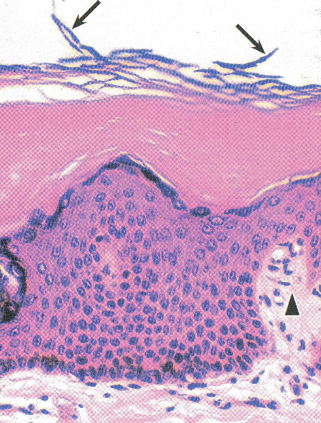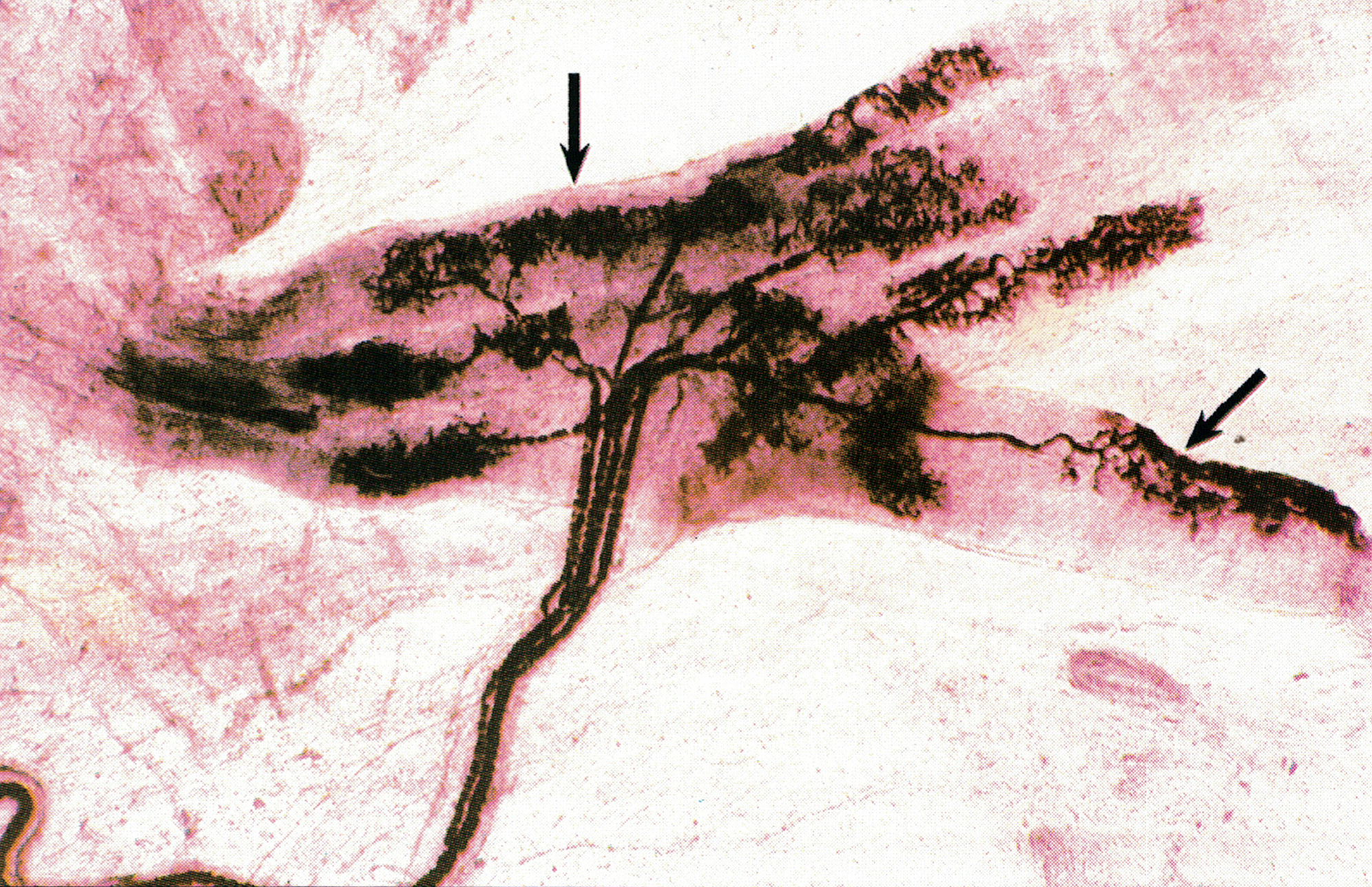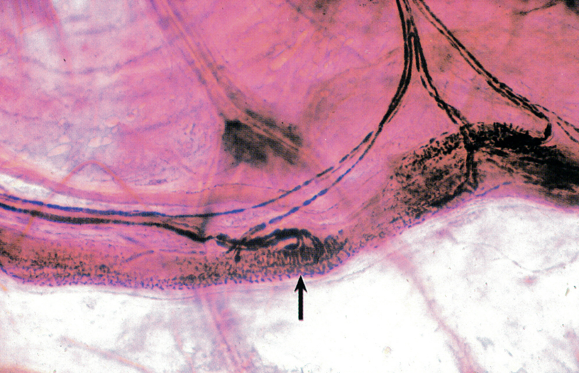 表皮呈棕黄色,一侧深染的山峰状结构为真皮结缔组织突向表皮的乳头,其内含呈棕黑色的神经纤维网。可见一支轴突末梢(已失去施万细胞)伸入表皮内,其末端在细胞间分为细支(↑)。此即游离神经末梢( free nerve ending),感受触、痛、冷、热等刺激。