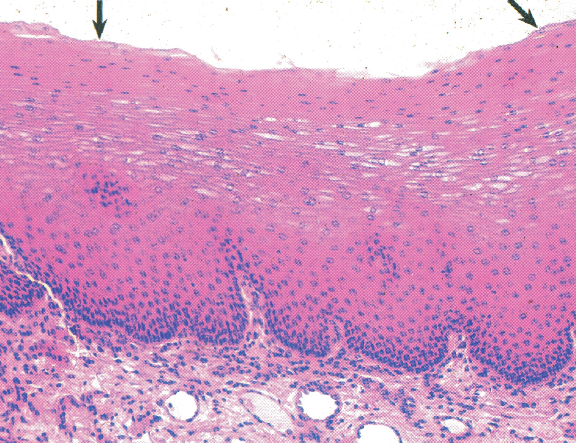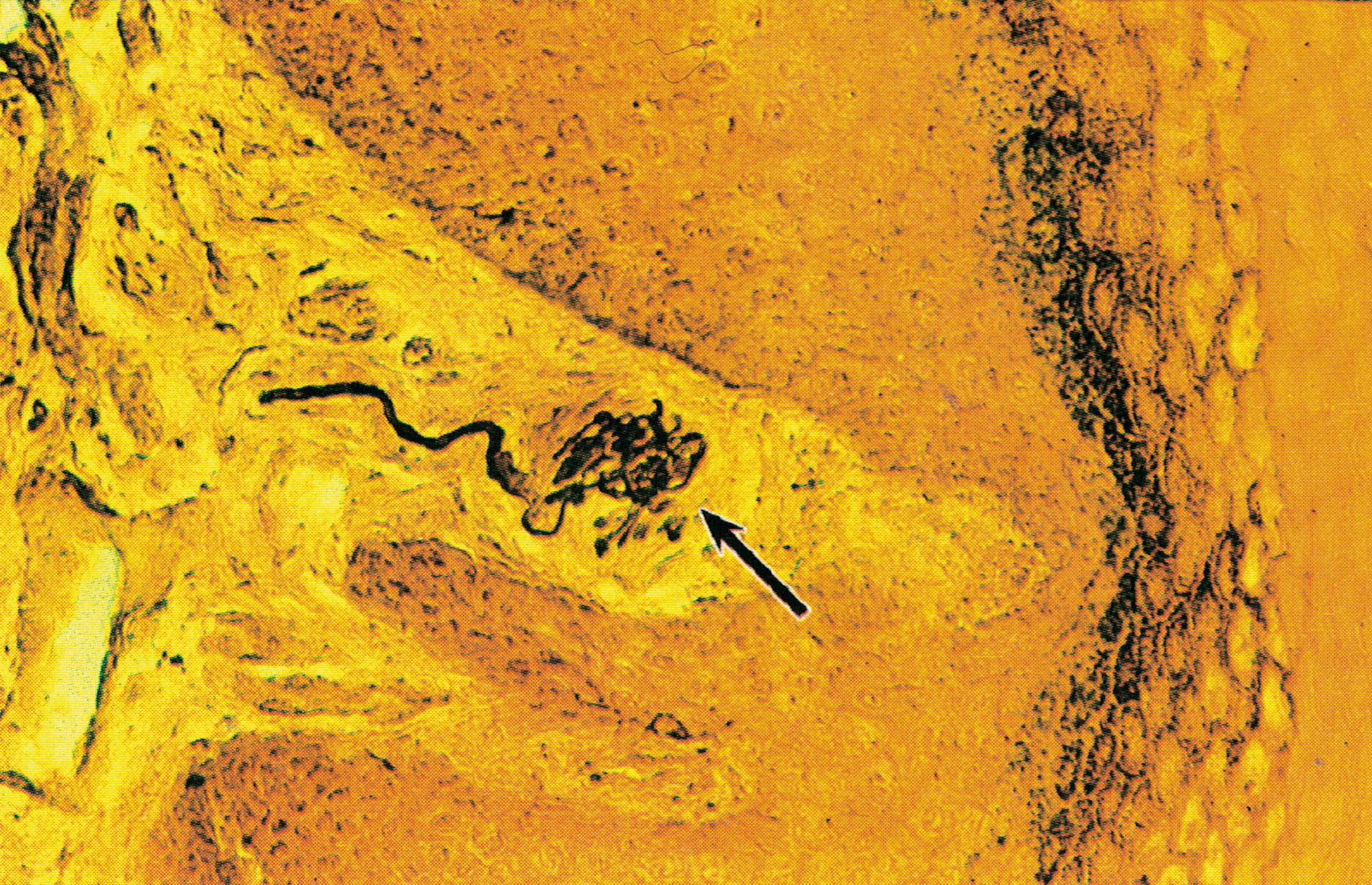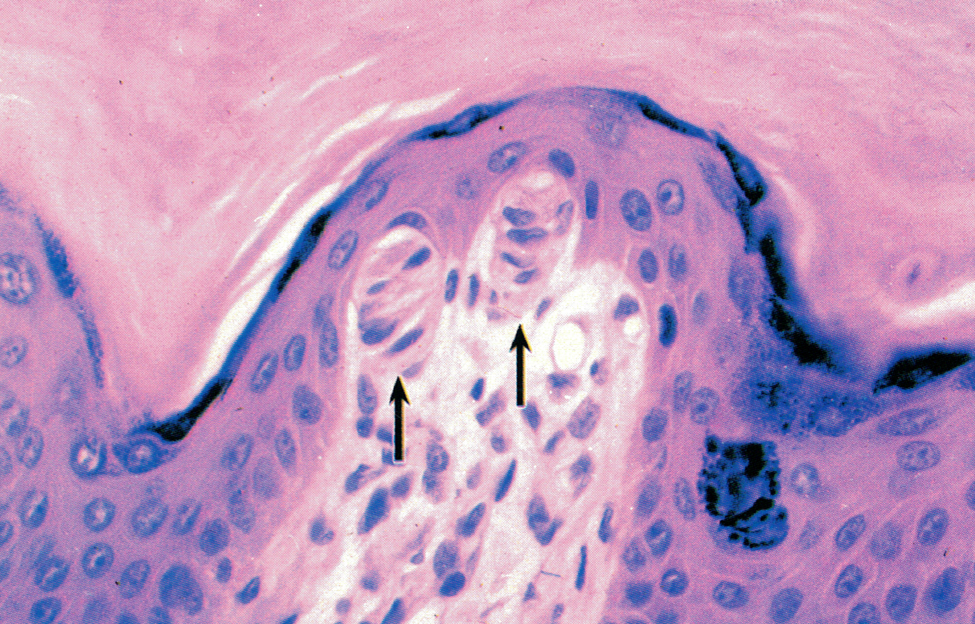 表皮呈棕黄色,一侧深染的山峰状结构为真皮结缔组织突向表皮的乳头,其内含呈棕黑色的神经纤维网。可见一支轴突末梢(已失去施万细胞)伸入表皮内,其末端在细胞间分为细支(↑)。此即游离神经末梢( free nerve ending),感受触、痛、冷、热等刺激。