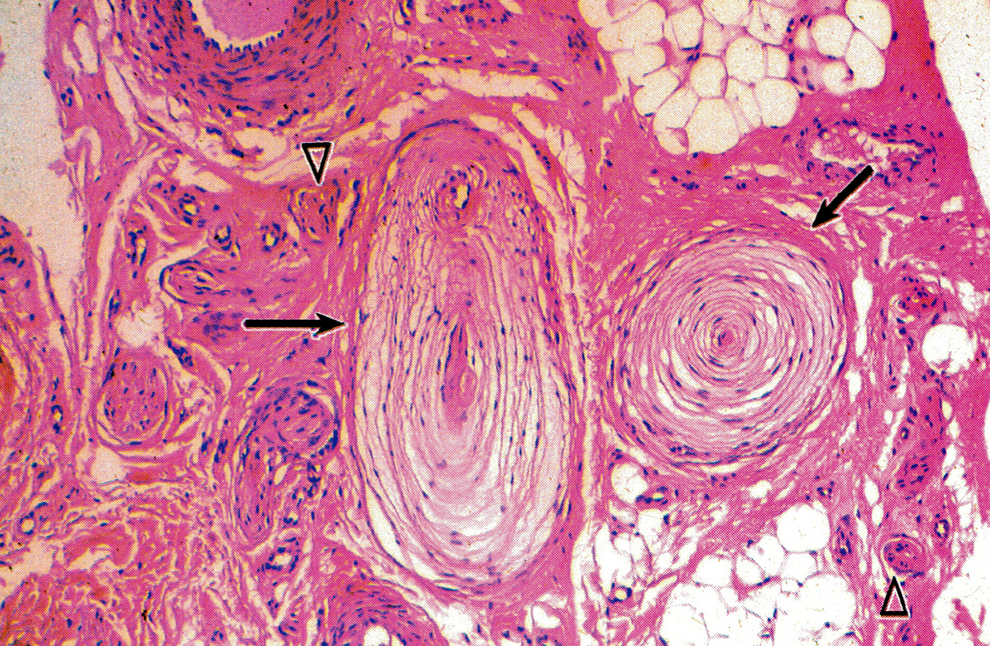 人皮下组织环层小体体积较大,圆形或卵圆形。外周部是由数十层同心圆排列的扁平细胞组成的被囊,神经纤维失去髓鞘,轴突穿入小体中轴的均质状圆柱体内。图示两个环层小体( lamellar corpuscle,Pacinian corpuscle),一个为横切,一个近似纵切(↑)。可见较细的神经纤维束(△)。环层小体感受压觉和振动觉刺激。