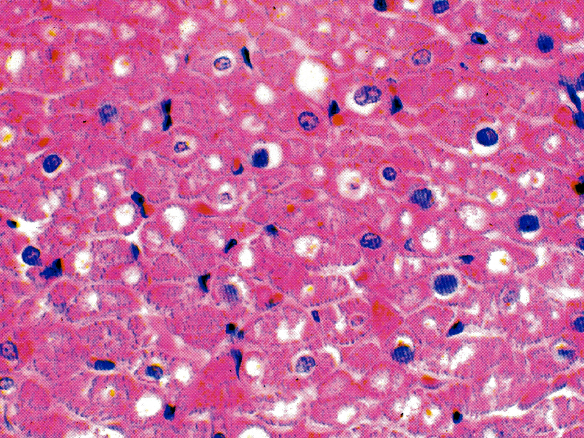 心肌纤维横切,纤维呈圆形,较骨骼肌纤维小。核居中心,未切到核的肌纤维中央富含肌浆而着色浅,肌原纤维(或称肌丝束)的横切呈细点状,分布在肌纤维的周边部。肌纤维间细胞的核染色较深,主要是成纤维细胞。