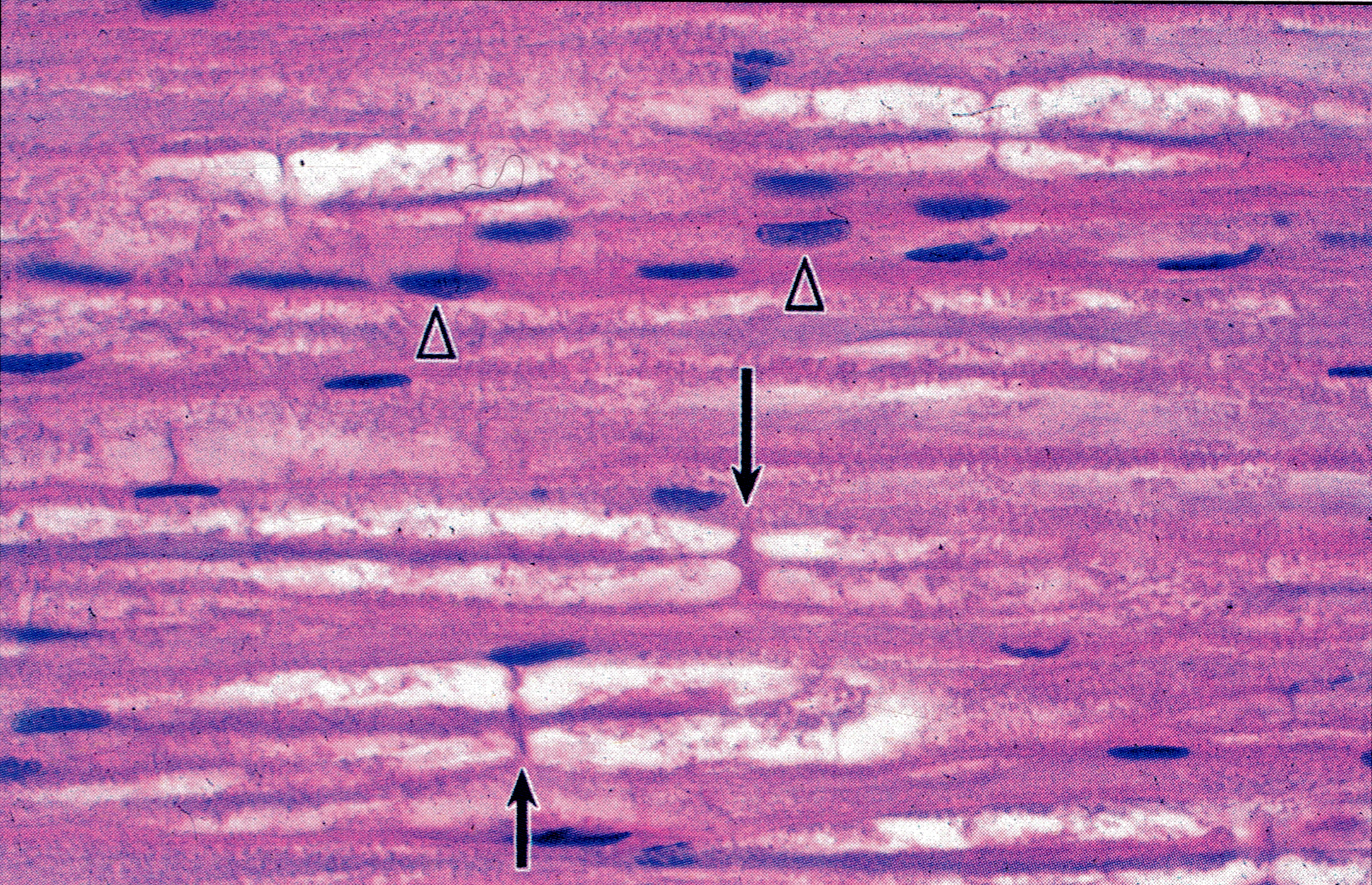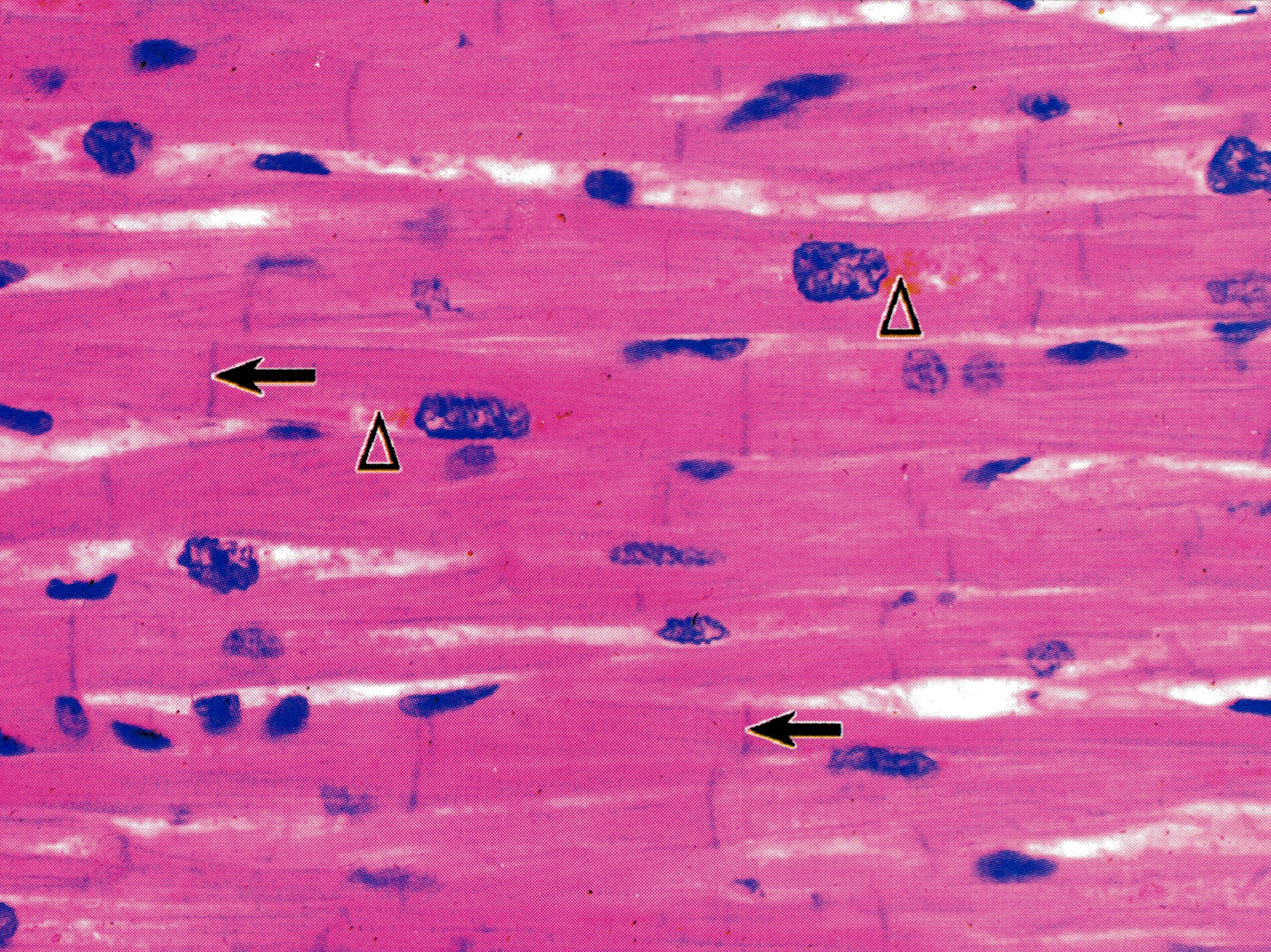 心肌纤维( cardiac muscle fiber)纵切,纤维呈柱状并分支框互连接,有明暗相间的横纹。核椭圆形,位居中央,有的肌纤维含双核,核周胞浆较多,着色较浅,可见内含的呈黄褐色的脂褐素(△)。闰盘( intercalated disc)呈深染的直行或阶梯状横线(↑),是由肌纤维间的连接结构所形成。