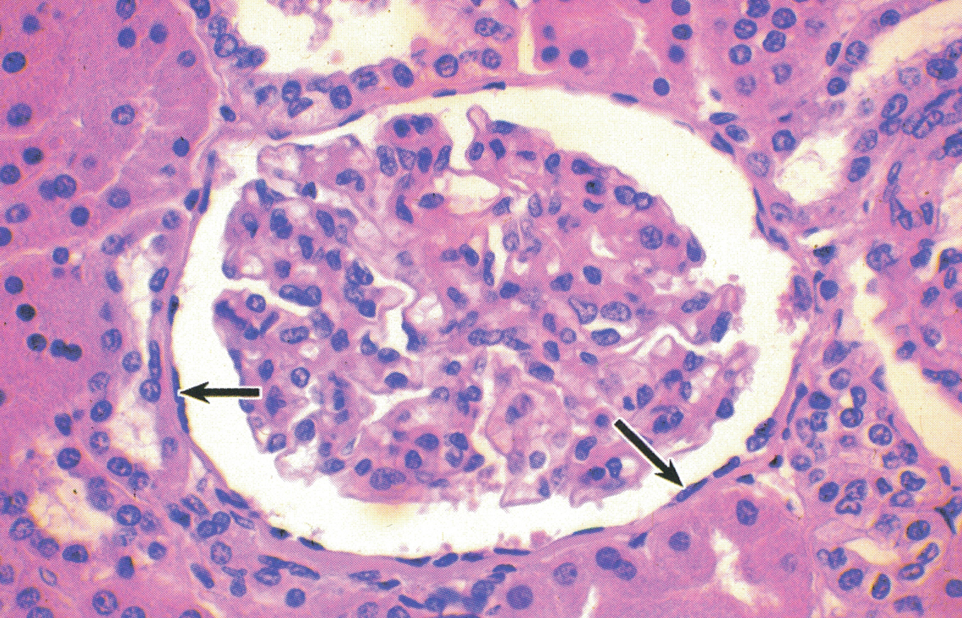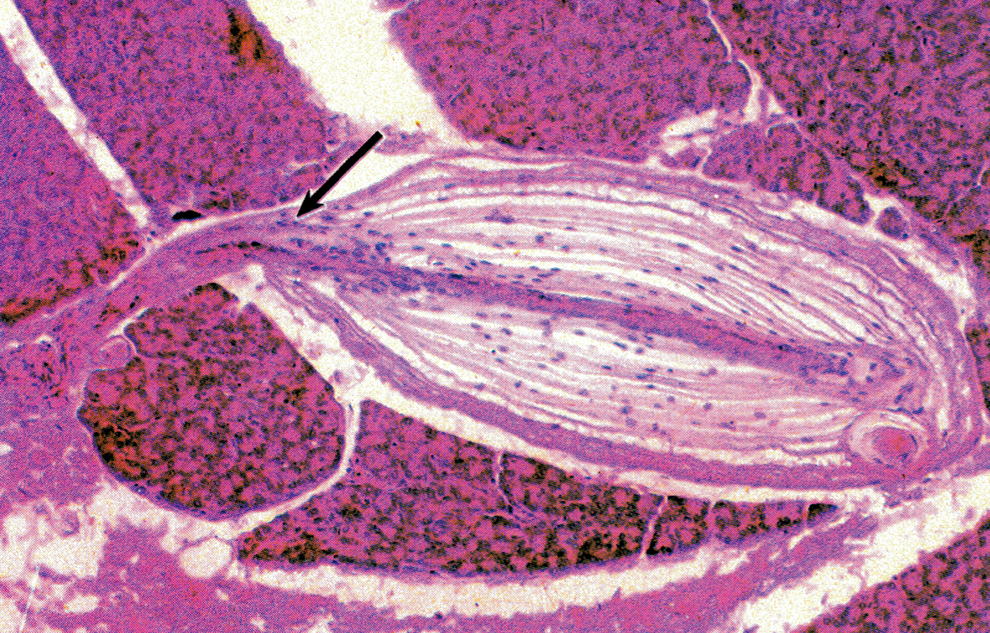 胰腺图示胰腺内一个环层小体经中轴的纵切面,可见中轴部的圆柱体。小体的一侧与神经纤维相连(↑)。