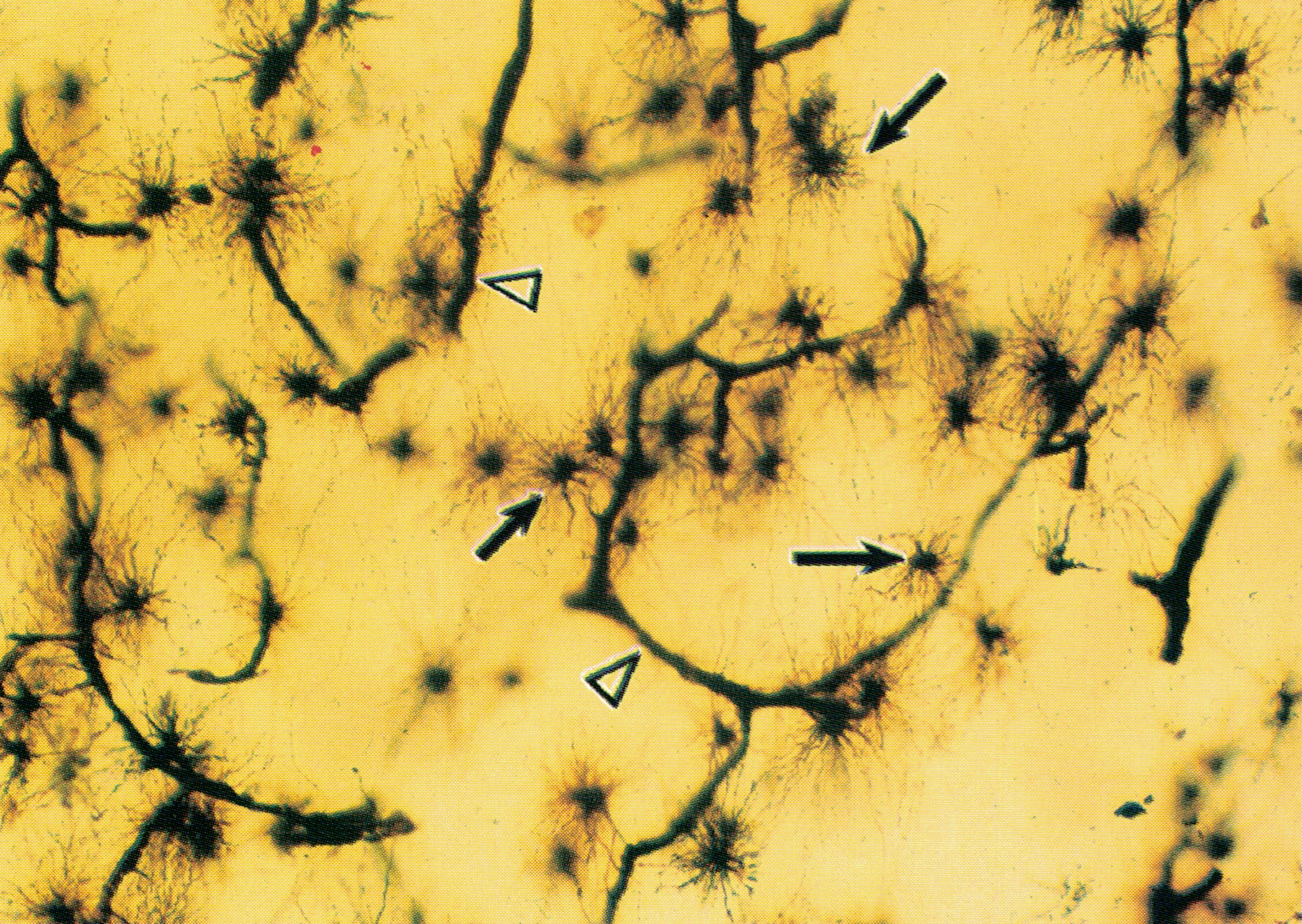 显示大脑皮质内大量星形胶质细胞( astrocyte)(↑),黑褐色的细胞多突起,呈星形,其中多数为纤维性星形胶质细胞。黑色条索为血管(△)。星形胶质细胞构成大脑皮质和髓质的支架,并参与组成血脑屏障,还与神经元的物质代谢相关。