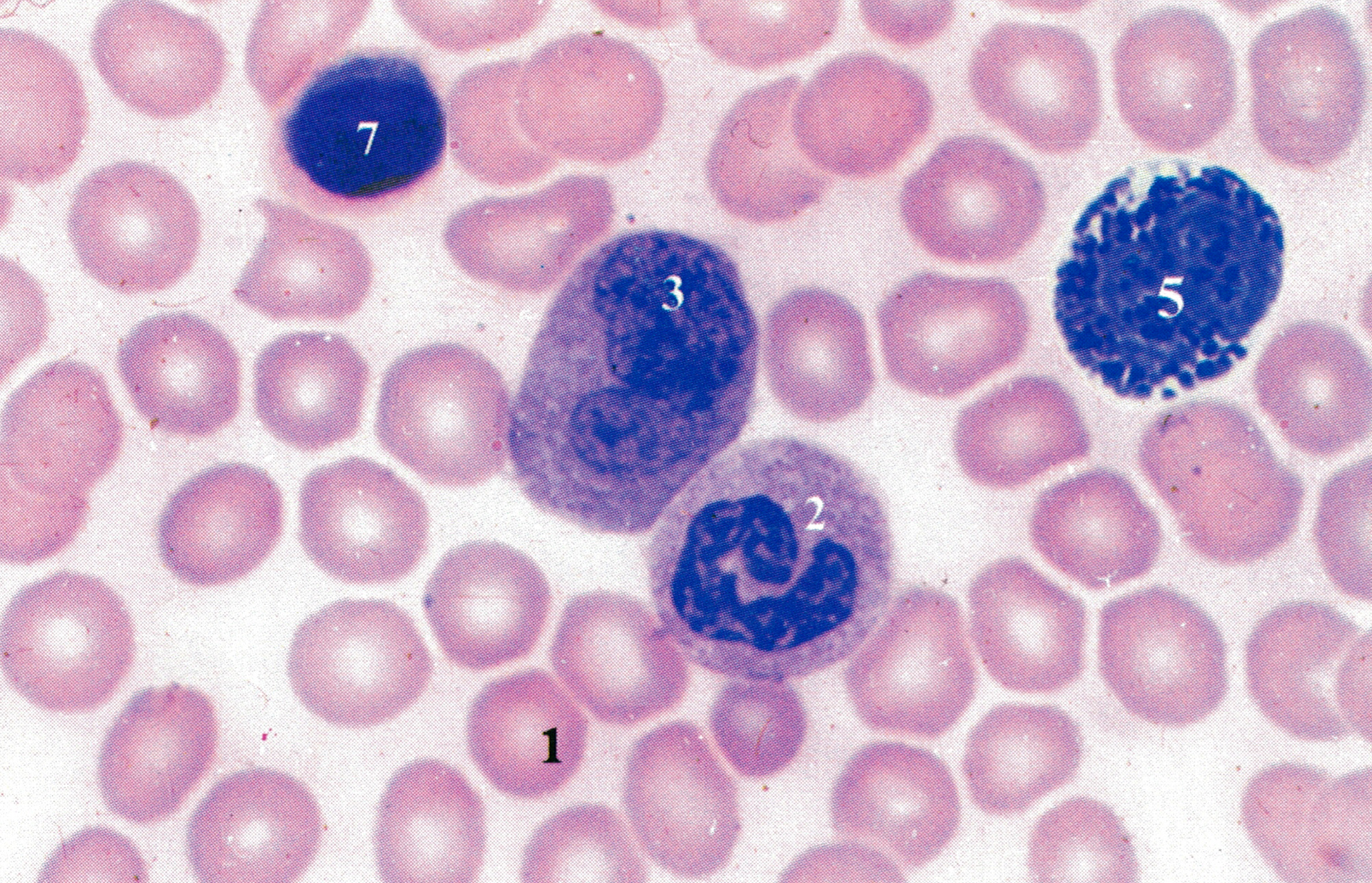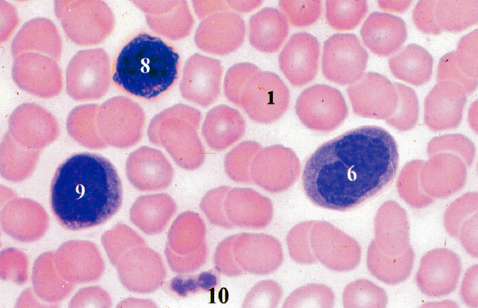 图示红细胞(l),中性粒细胞(杆状核)(2),中性粒细胞(分叶核)(3),嗜酸性粒细胞(4),嗜碱性粒细胞(5),单核细胞(6),小、中、大淋巴细胞(7,8,9),血小板(10)o红细胞(erythrocyte)较小,双凹圆盘形,中央薄,染色浅,周边厚,染色深,胞质内充满血红蛋白( hemoglobin),无核,无细胞器。红细胞具有结合和运输02与CO2的功能。中性粒细胞(neutrophil)的核呈杆状或分叶(25叶),胞质内可见淡红色的细小颗粒;细胞具有趋化性运动和吞噬能力,急性炎症时增多,在病灶处吞噬细菌等,变为脓细胞( pyocyte)。嗜酸性粒细胞( eosinophil)的核多分2叶,胞质内含染深红色的粗大颗粒,在感染寄生虫和变态反应时增多;细胞具趋化性运动,能吞噬抗原抗体复合物,释放组胺酶( histaminase),减轻过敏反应。嗜碱性粒细胞( basophil)的核形不规则或分叶,胞质内含染紫蓝色大小不一的颗粒;细胞性能与肥大细胞相似,可释放组胺\白三烯和肝素。单核细胞( monocyte)体积较大,核呈肾形,染色质松散呈细网状,胞质着灰蓝色,内含细小的嗜天青颗粒( azurophilic granule);细胞具趋化性运动和吞噬能力,穿出血管外分化为巨噬细胞,总称单核吞噬细胞系统( mononuclear phagocytic system)o淋巴细胞( lymphocyte)的核圆形或椭圆形,染色质较浓密而着色深,胞质呈蔚蓝色,含少量嗜天青颗粒;细胞体积大、中、小不一,小淋巴细胞居多,它们均具有重要的免疫功能,按功能性质分为T细J咆( thymus - dependent lymphocyte,T cell)\细胞(bone mar-row - dependent lymphocyte,B cell)\杀伤(K)细胞(killer cell)和自然杀伤(NK)细胞(natural killer cell)o血小板(blood platelet)是骨髓巨核细胞( megakaryocyte)胞质脱落的小块,体积甚小,无核,胞质内有线粒体、微丝、微管等细胞器,还可见血小板颗粒;血小板在凝血和止血过程中起重要作用。