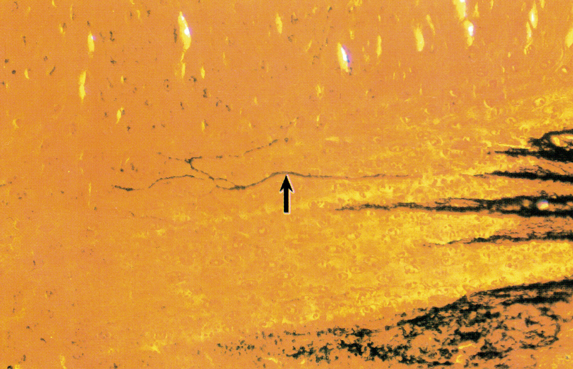 小胶质细胞( microglia)染成黑色。胞体多呈梭形,突起较细长,常从胞体的两极伸出,突起上有小刺样结构(↑)。小胶质细胞的来源和性质不同于其他胶质细胞,它源于血液单核细胞,有吞噬功能,属单核吞噬细胞系统。