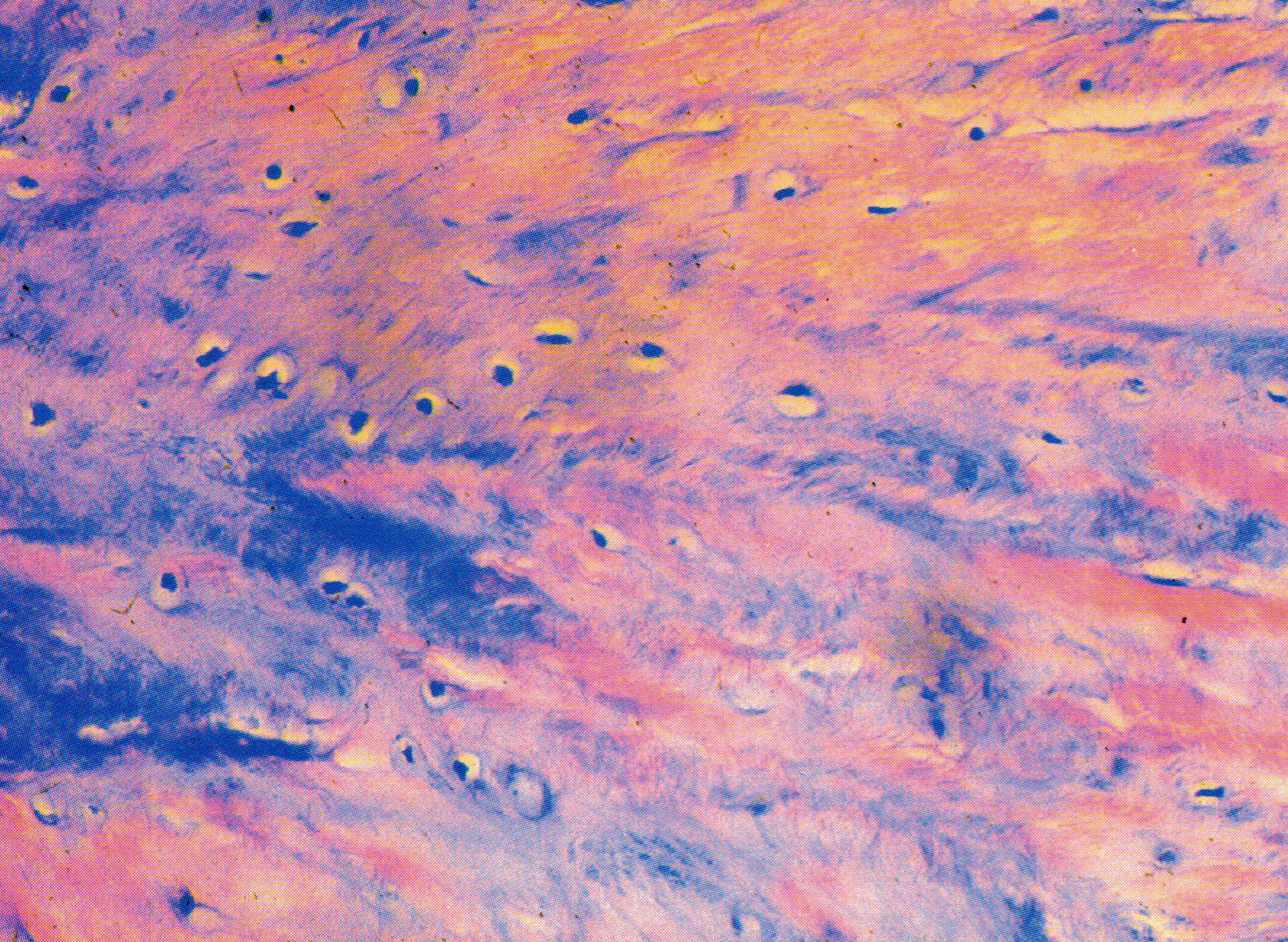 纤维软骨( fibrous cartilage)的间质多,细胞少。间质内含大量胶原纤维,纤维与基质的分布不均,故间质呈不均匀的红色和紫蓝色。细胞较小,也可见陷窝。细胞大多散在分布,可见少量同源群现象。