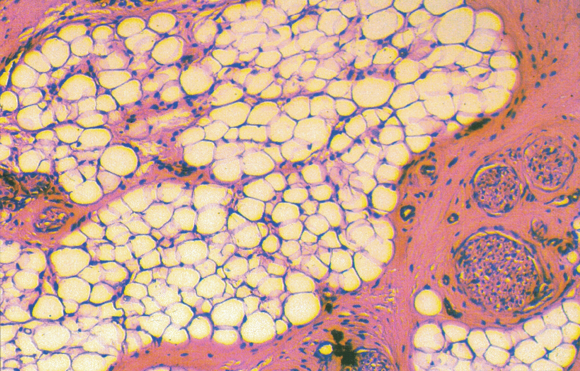 通常所称的脂肪组织( adipose tissue)为黄(白)色脂肪组织,主要由单泡脂肪细胞聚集而成,分布广泛,其分布状况和量的个体差异甚大。脂肪组织是机体的贮能库,并有保持体温和缓冲\支持等作用。