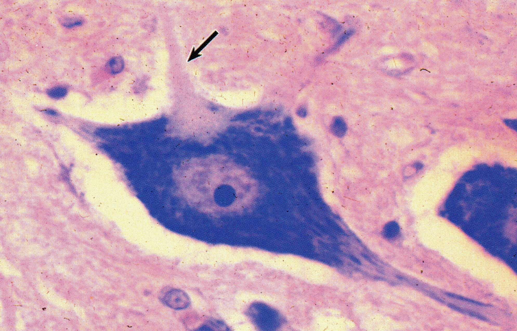 示一个前角神经元,有多个突起(  neurite),胞体(soma)内的核大而圆,染色浅,核仁明显。核周质( perikaryon)内的尼氏体较大而多,切片中所见形似”虎斑”。一个突起内无尼氏体,为轴突(axon)(↑),其起始部胞质内无尼氏体而色浅,为轴丘(axonhillock)。其余突起内含多少不一的尼氏体,为树突(dendrite)o尼氏体是由群集的粗面内质网和核糖体组成,轴突内无尼氏体,不能合成蛋白质。