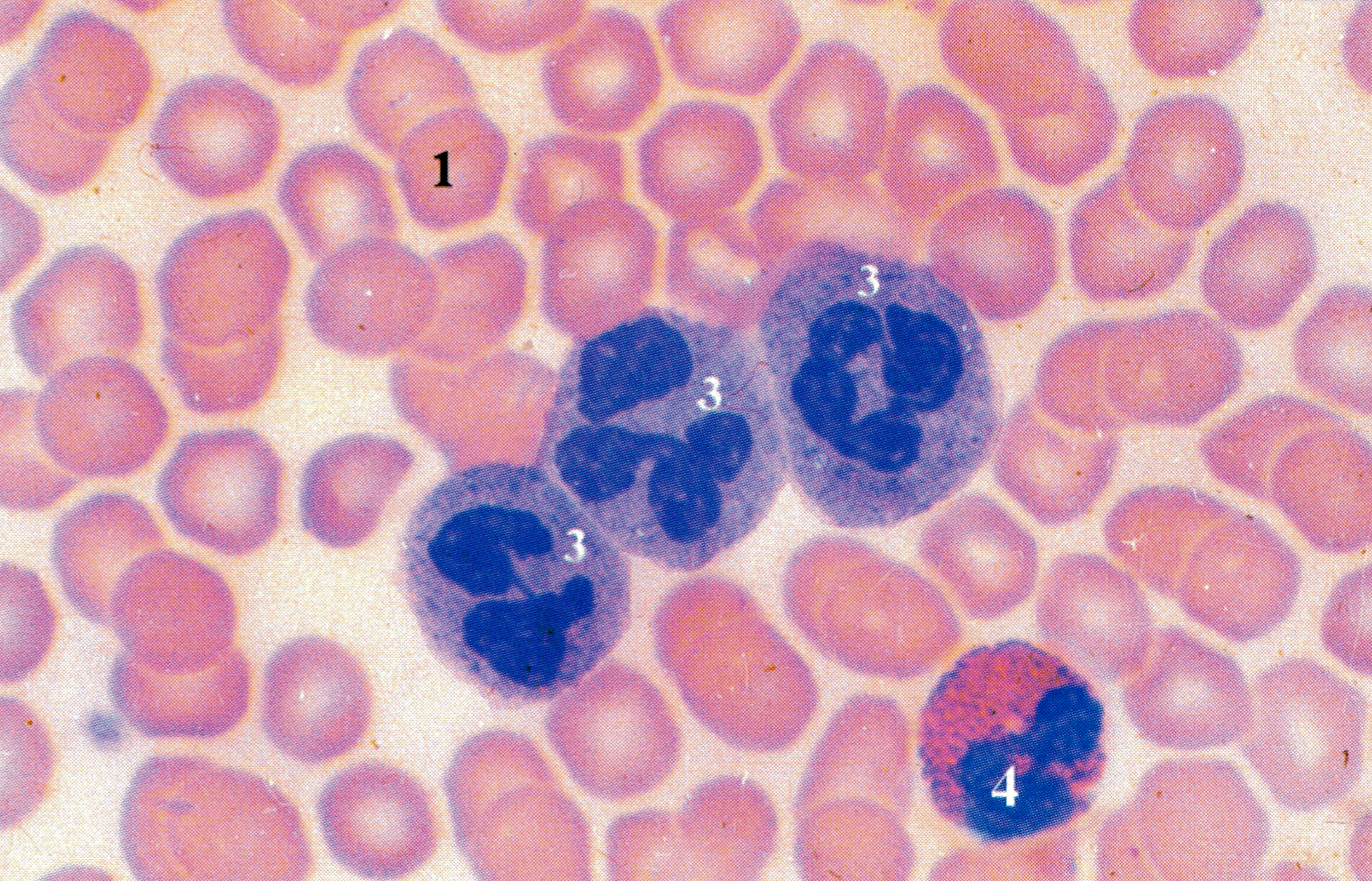 血细胞人血液涂片瑞特染色(W-ight stain-ing)3.3×100(A、B、C)(上海铁医,上海医大)