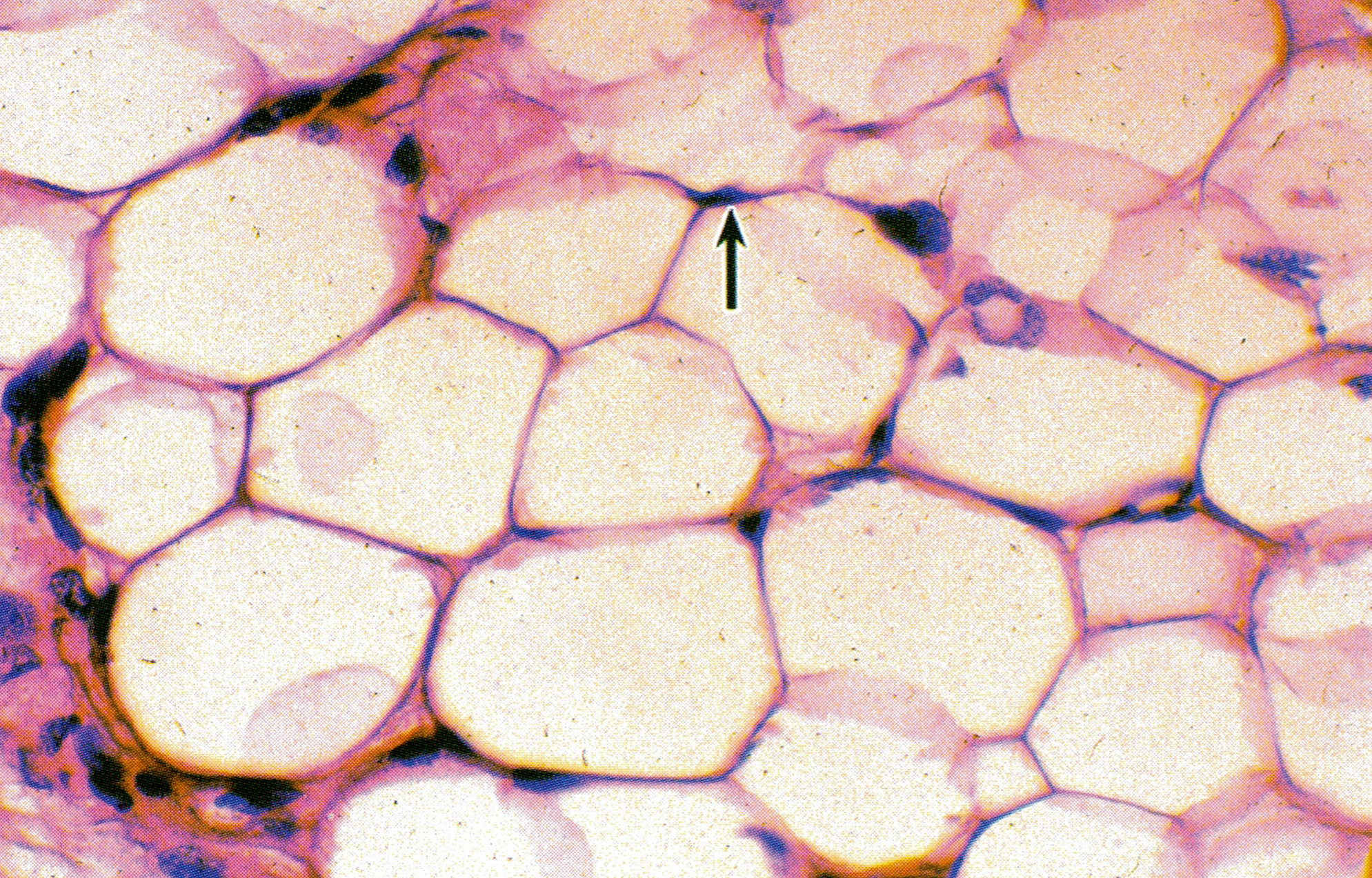 人皮下组织HE染色脂肪细胞(adipocyte,fat cell)胞质内含一大脂滴,在常规制片过程中脂质被溶解而呈空泡状。脂滴外周为薄层胞质,核也被脂滴推挤至细胞一侧,呈扁平状(↑)。通常所称的脂肪细胞即此种单泡脂肪细胞,细胞分布广泛,多聚成群,构成脂肪组织。