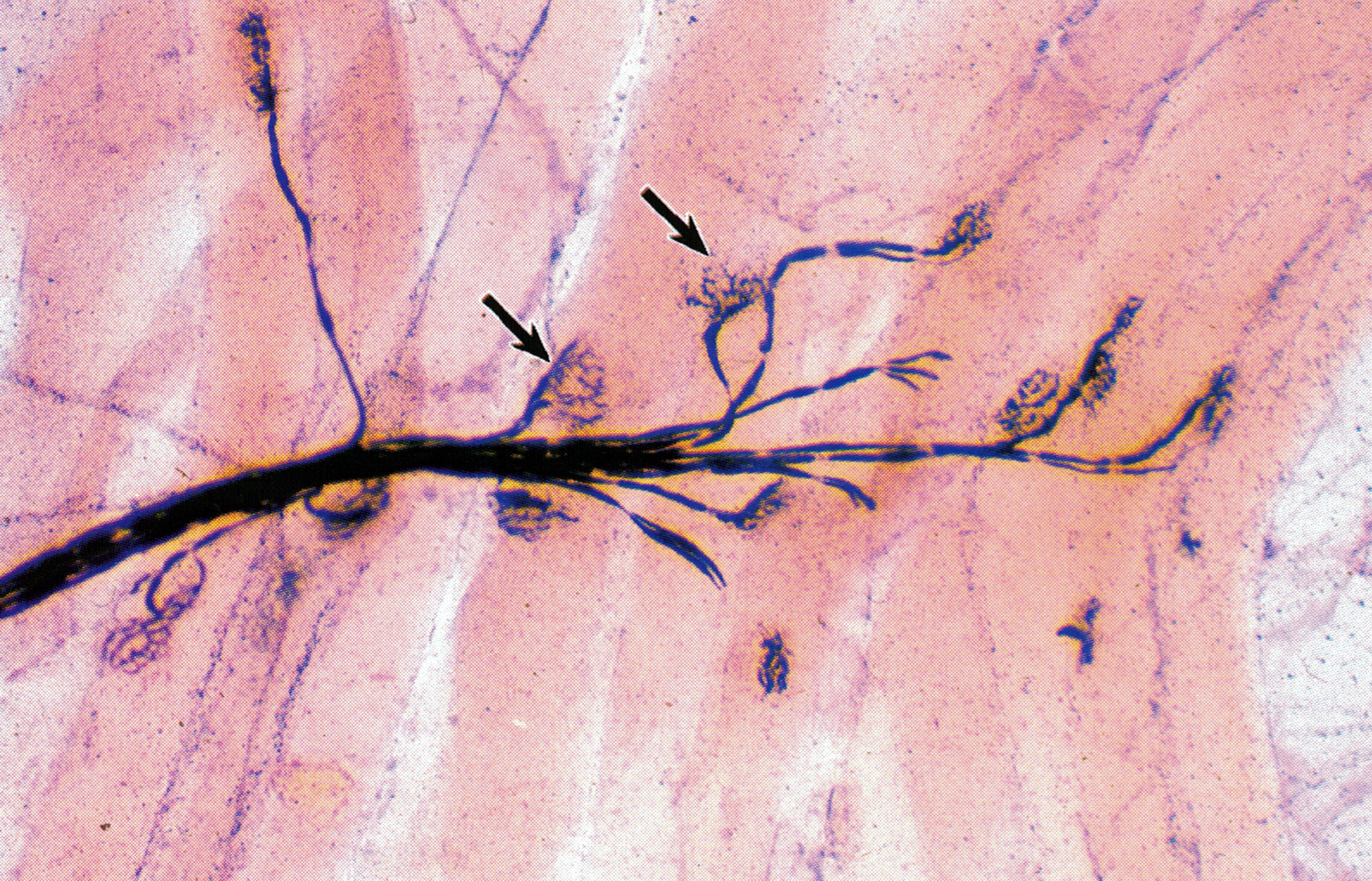 运动终板( motor end plate)是一种躯体运动神经末梢,分布于骨骼肌纤维,将神经冲动传递给肌纤维,引起肌纤维的收缩。图示几条神经纤维的轴突(着黑色),其分支末梢呈爪状附在骨骼肌纤维上(↑)。一条有髓运动神经纤维的轴突,可分支支配多条骨骼肌纤维。一个运动神经元(脊髓前角和脑干内)的轴突及其所支配的全部骨骼肌纤维,合称一个运动单位( motor unit)。