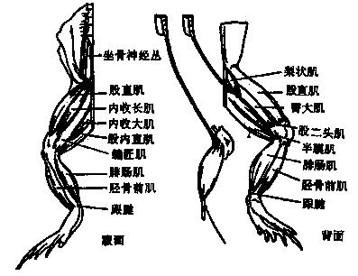 4.剥离神经  用玻璃分针将坐骨神经丛分离清楚,再从大腿背面股二头肌和半膜肌的夹缝中分离出坐骨神经。用粗剪刀将和坐骨神经连接的下部脊柱多余部分剔去。以镊子夹着与神经相连的脊柱骨、提起神经,并用跟科剪将坐骨神经向大腿及其它部位发出的神经分支剪断,一直将坐骨神经分离至膝关节为止(3)