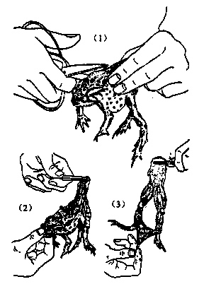 1.破坏神经系统  以左手握住蟾蜍,食指压住其头部并略下弯,将探针自枕骨大孔插入,左右横断脊髓,再向前搅毁脑,然后将探针撤回伸人脊椎管中搅毁脊髓。如果蟾蜍中枢神经破坏完全,其全身肌肉则完全松弛(1)