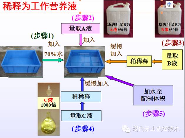 在实际生产应用上,营养液的配制方法可采用先配制浓缩营养液(或称母液)然后用浓缩营养液配制工作营养液;也可以采用直接称取各种营养元素化合物直接配制工作营养液。可根据实际需要来选择一种配制方法。但不论是选择哪种配制方法,都要在配制过程中以不产生难溶性物质沉淀为总的指导原则来进行。