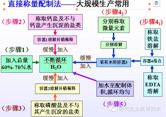 在大规模生产中,因为工作营养液的总量很多,如果配制浓缩营养液后再经稀释来配制工作营养液,势必需要配制大量的浓缩营养液,这将给实际操作带来很大的不便,因此,常常称取各种营养化合物来直接配制工作营养液。
