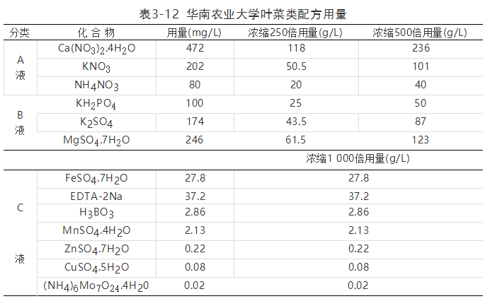 表3-12为华南农业大学叶菜类配方的浓缩营养液的各种化合物分类及用量。其它配方可以此为例进行分类。