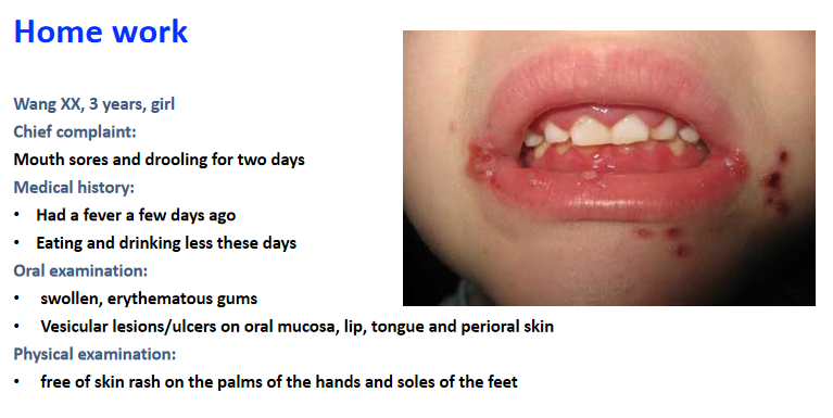 Vesicular lesions develop on oral mucosa, lip and tongue;
