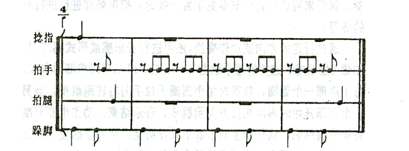 声势活动是奥尔夫体系独特的学习方式之一,是一种用简单而原始的身体动作发出各种有节奏声音的活动,即用捻指、拍手、拍腿、跺脚进行节奏训练。奥尔夫教育体系又把这种活动称为演奏身体乐器的活动。