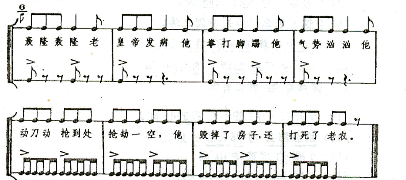 节奏朗诵活动不只限于单声部的训练,也可以用多声部进行训练(这在前面已列举了谱例)。