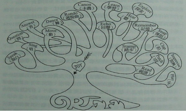 树的根部是以奥尔夫的教育思想为基础,树中心是“joy”(喜悦),在快乐及对音乐的热爱中,进行种种音乐的学习活动,即树叶所示。