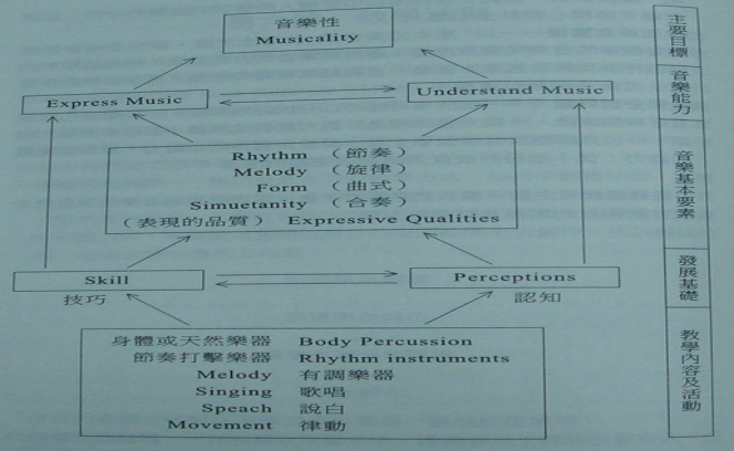用自然的、原始的素材,综合性地、自然性地引导学童去经验,在自然地参与音乐中,去感受音乐、创作音乐、欣赏音乐及学习音乐。