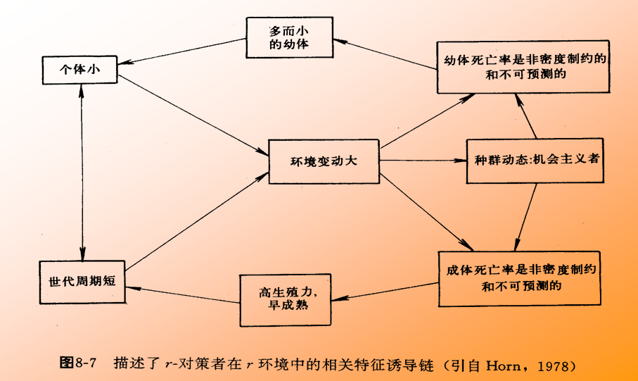 r-对策者的栖息环境是不稳定的﹑多变的,因而种群密度也难免处于经常激烈变动状态。个体小﹑寿命短有利于高的r 值,能使它们在有利条件下迅速占领生境。因为它们占有的生境常是生态真空的,因而竞争能力不发达,对捕食者的防御能力比较弱,死亡率很高。但它们的高出生率可以弥补死亡的消耗。当种群密度过高和把资源耗尽时,这类动物具有较强的扩散能力,迁移恶化的生境到别处建立新的种群;有的种群则以休眠形式潜伏下来。